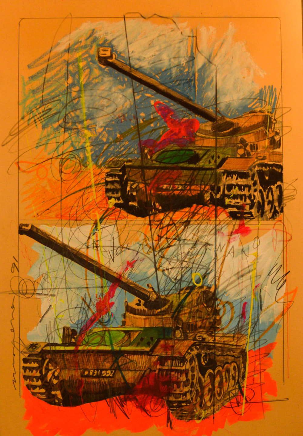 ENRICO MANERA Eritrea 1947 Carri armati mista su cartone 102x70 / autentica...