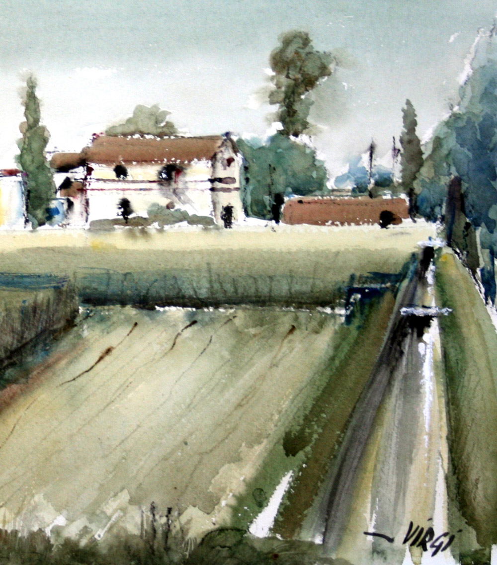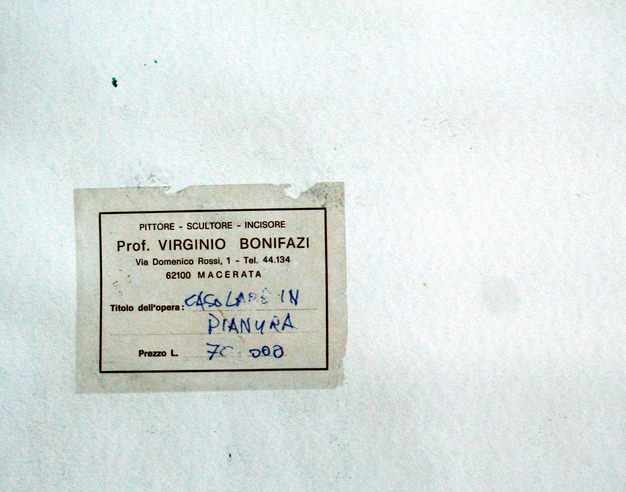 Virginio Bonifazi 1918, Macerata (Mc) - 1997, Macerata (Mc) - [Italia] Casolare in pianura acquerello su carta 50x64 c. 1965 firma dell’artista in basso a destra certificato di provenienza garantita Picenum