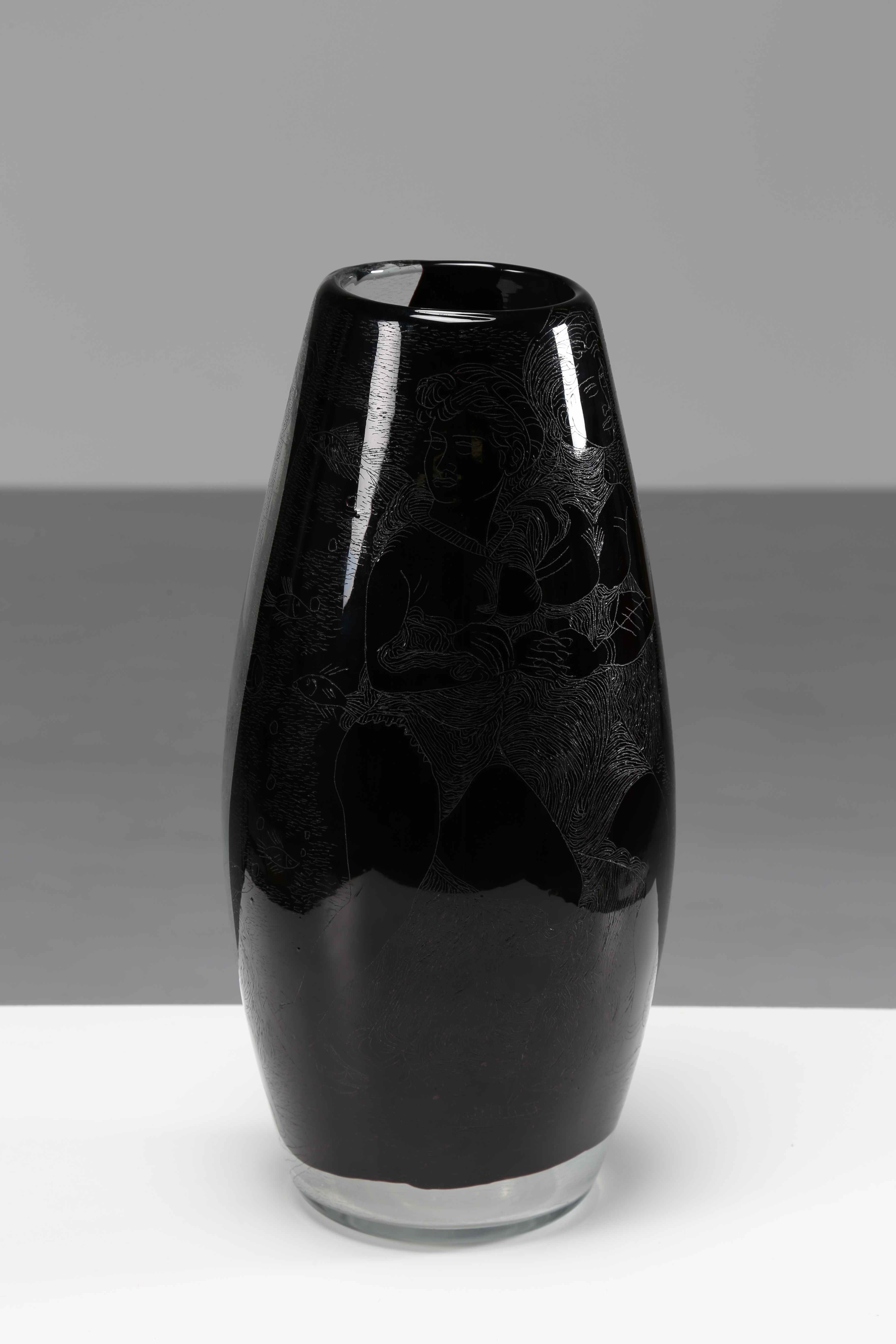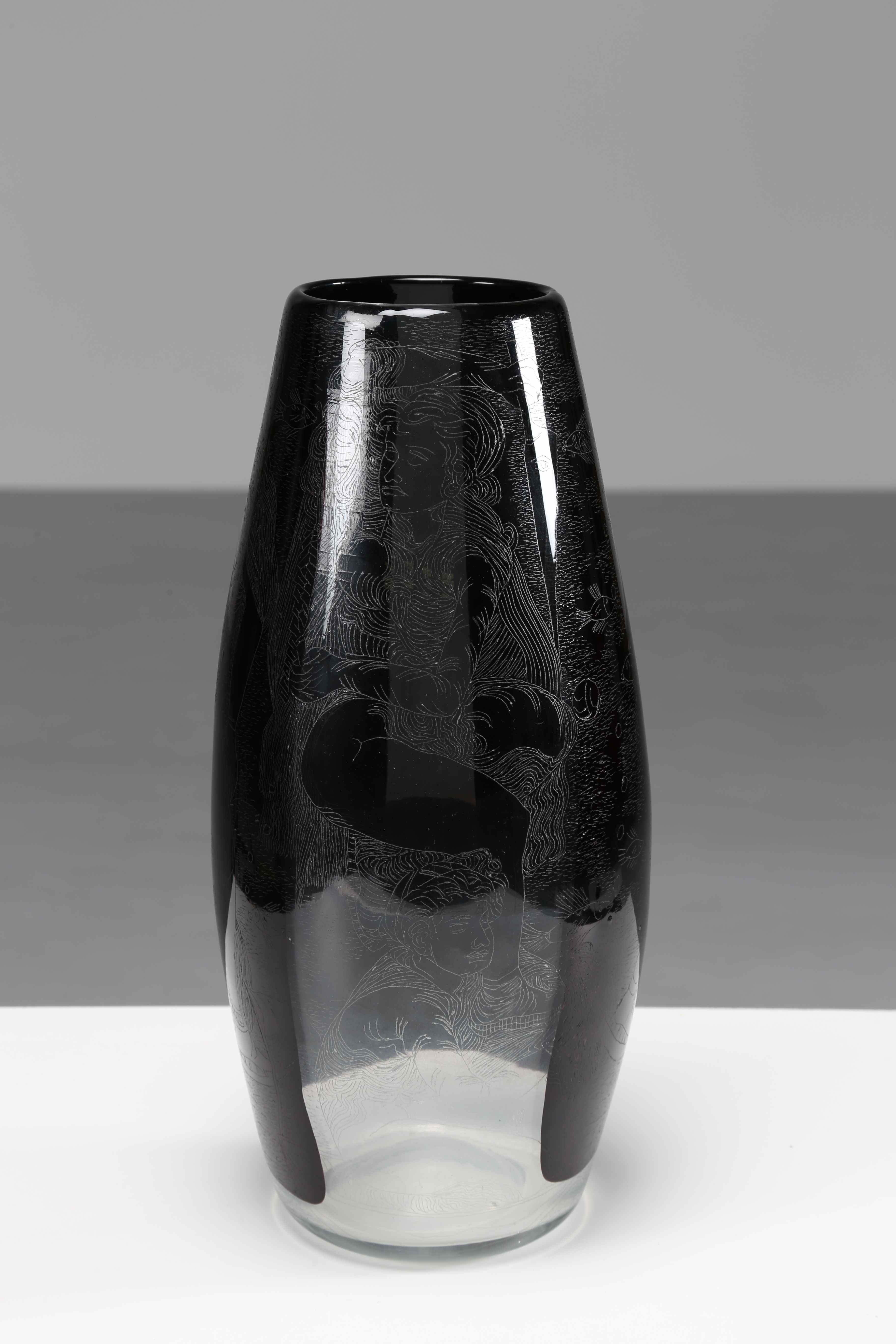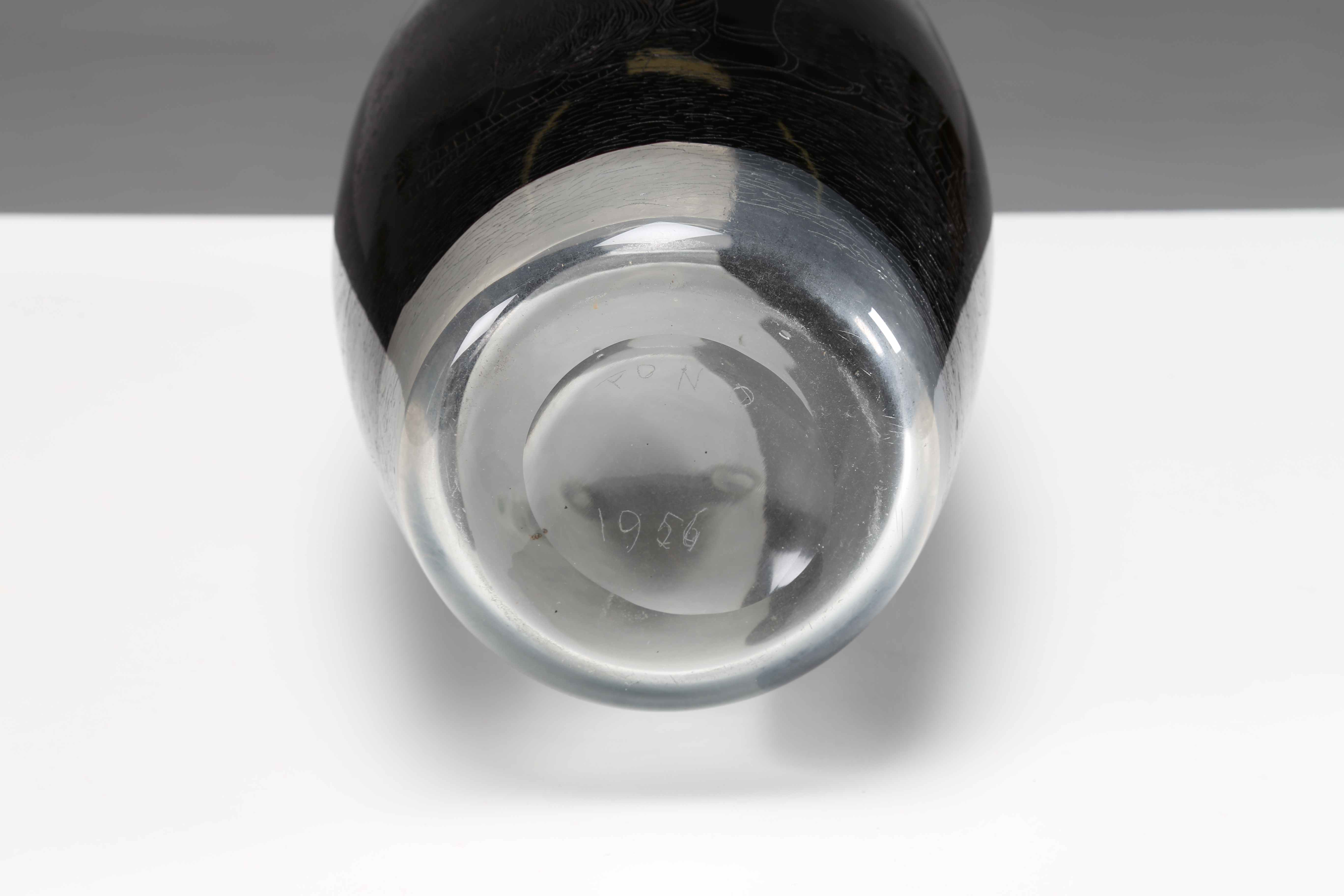 ZANCANARO TONO (1906 - 1985) Vaso inciso alla rotella dall'artista. 1956. Vetro di Murano. Cm 18,00 x 38,50. Firma e anno alla base. Probabilmente realizzato da Vetrerie Ivr Mazzega.