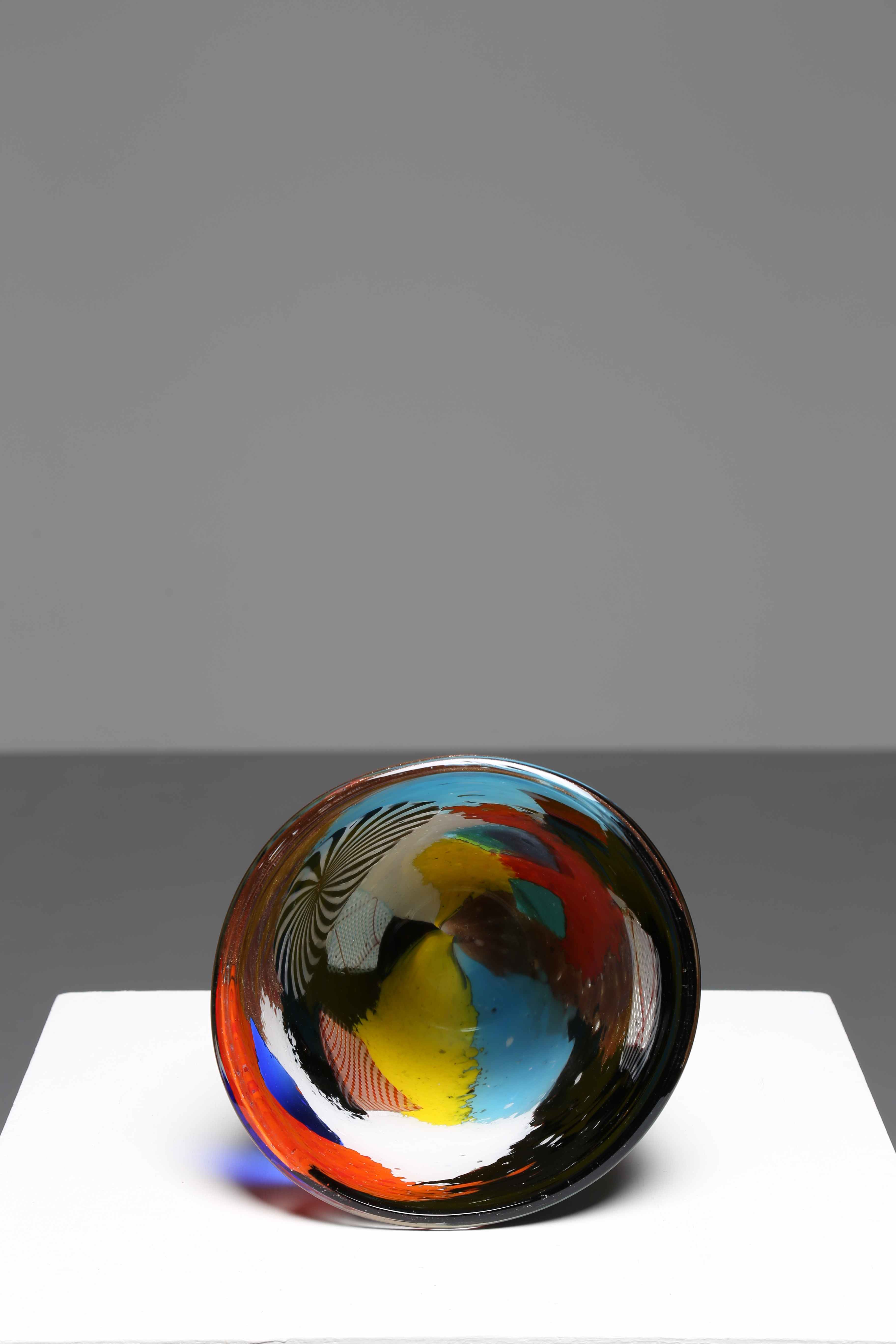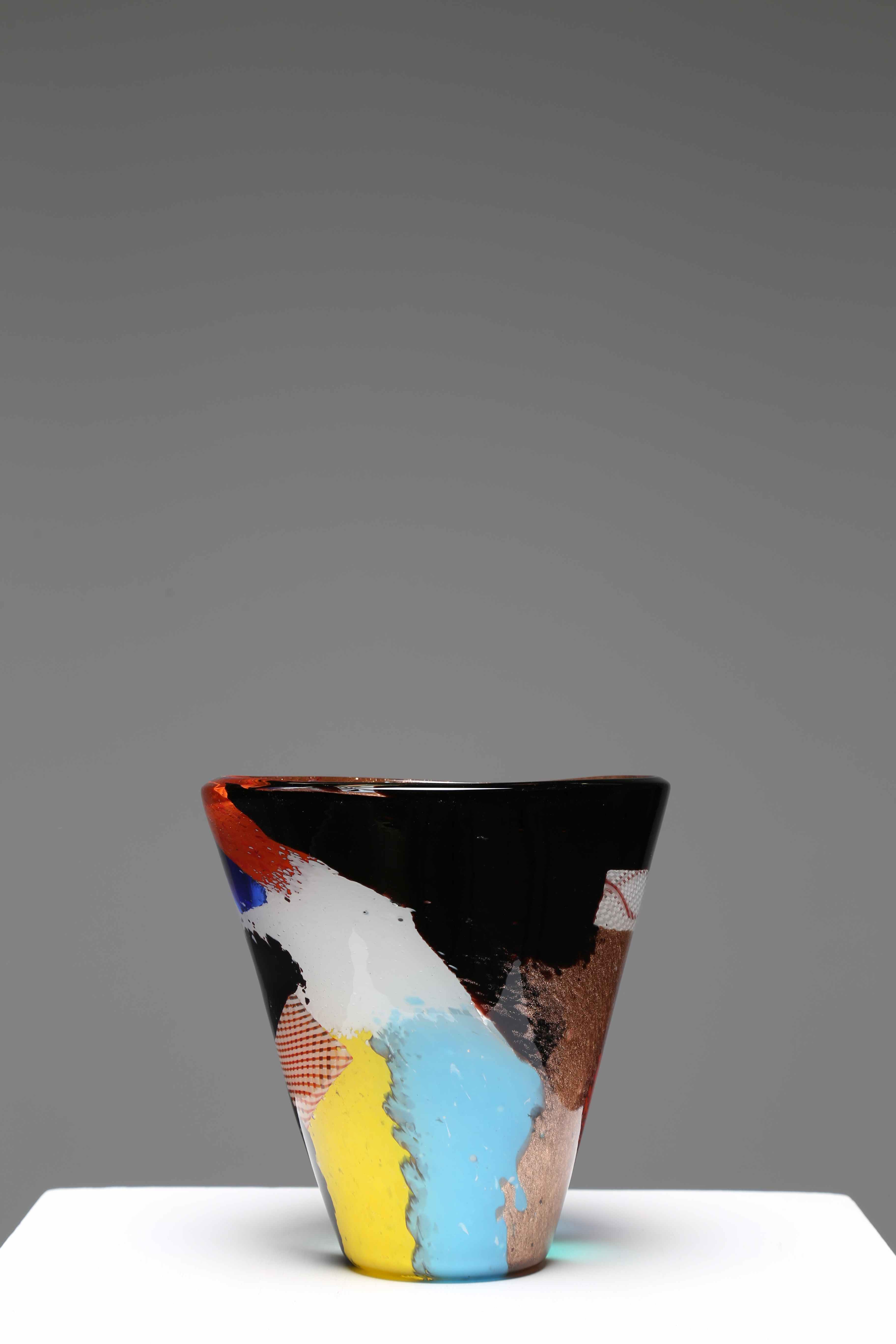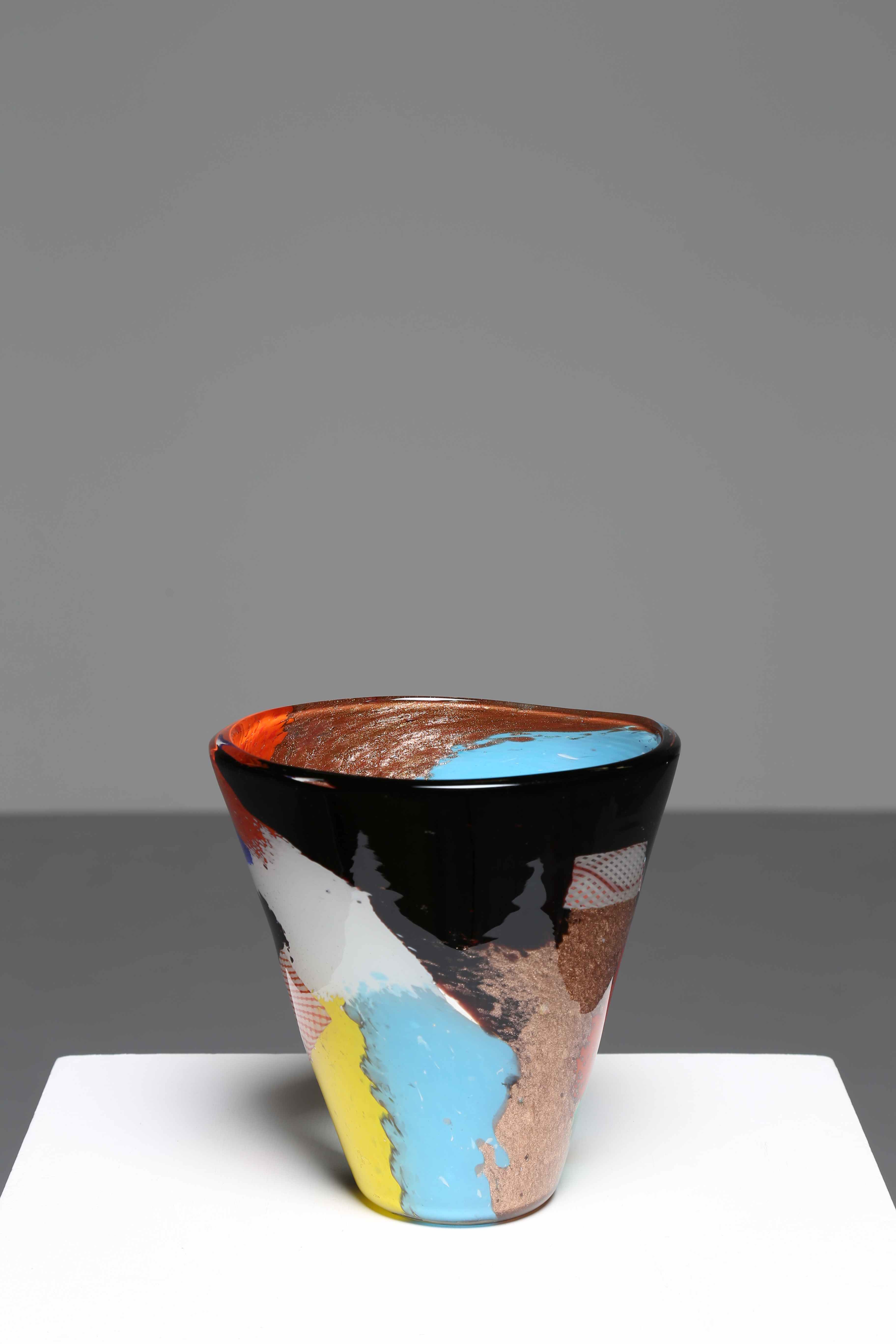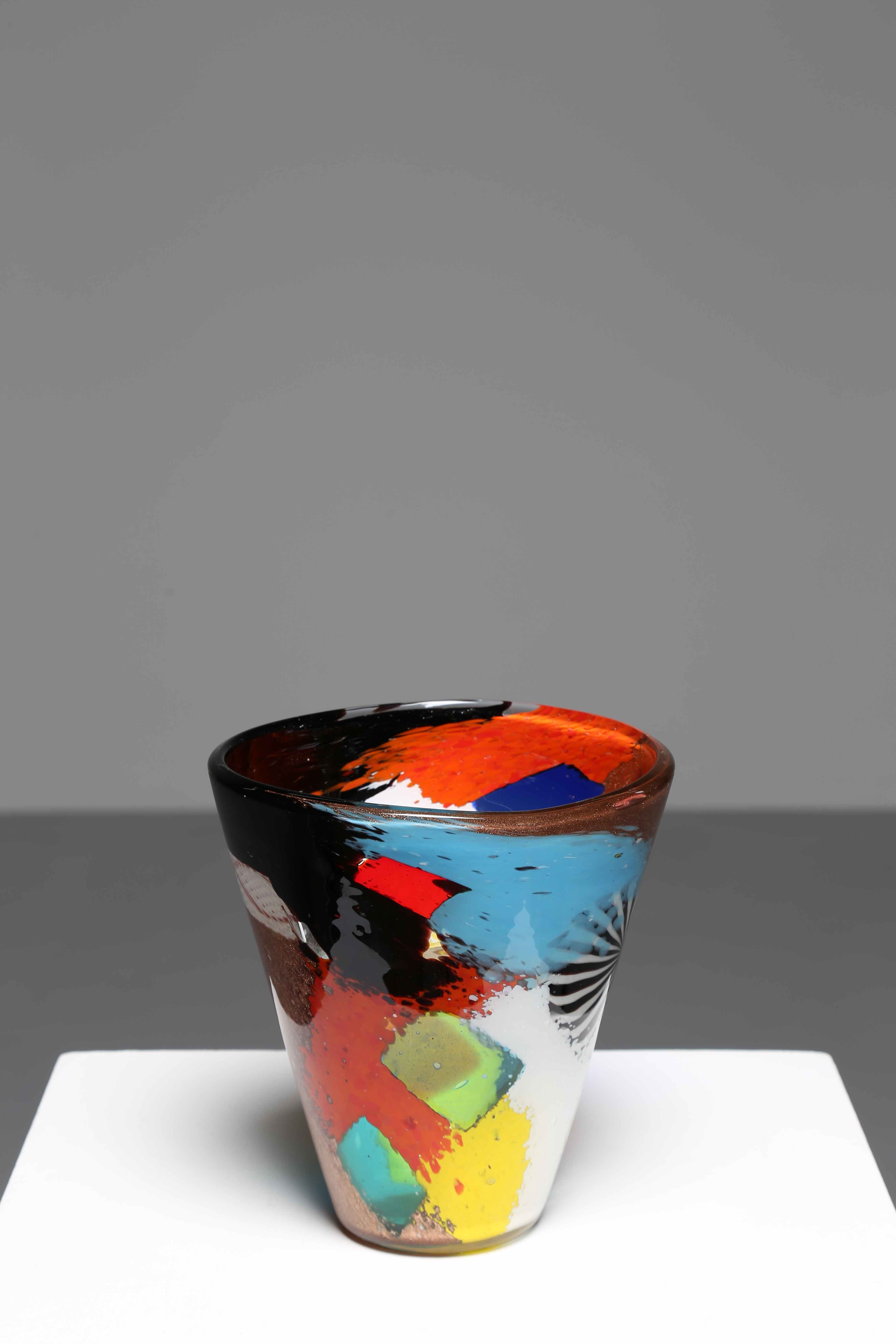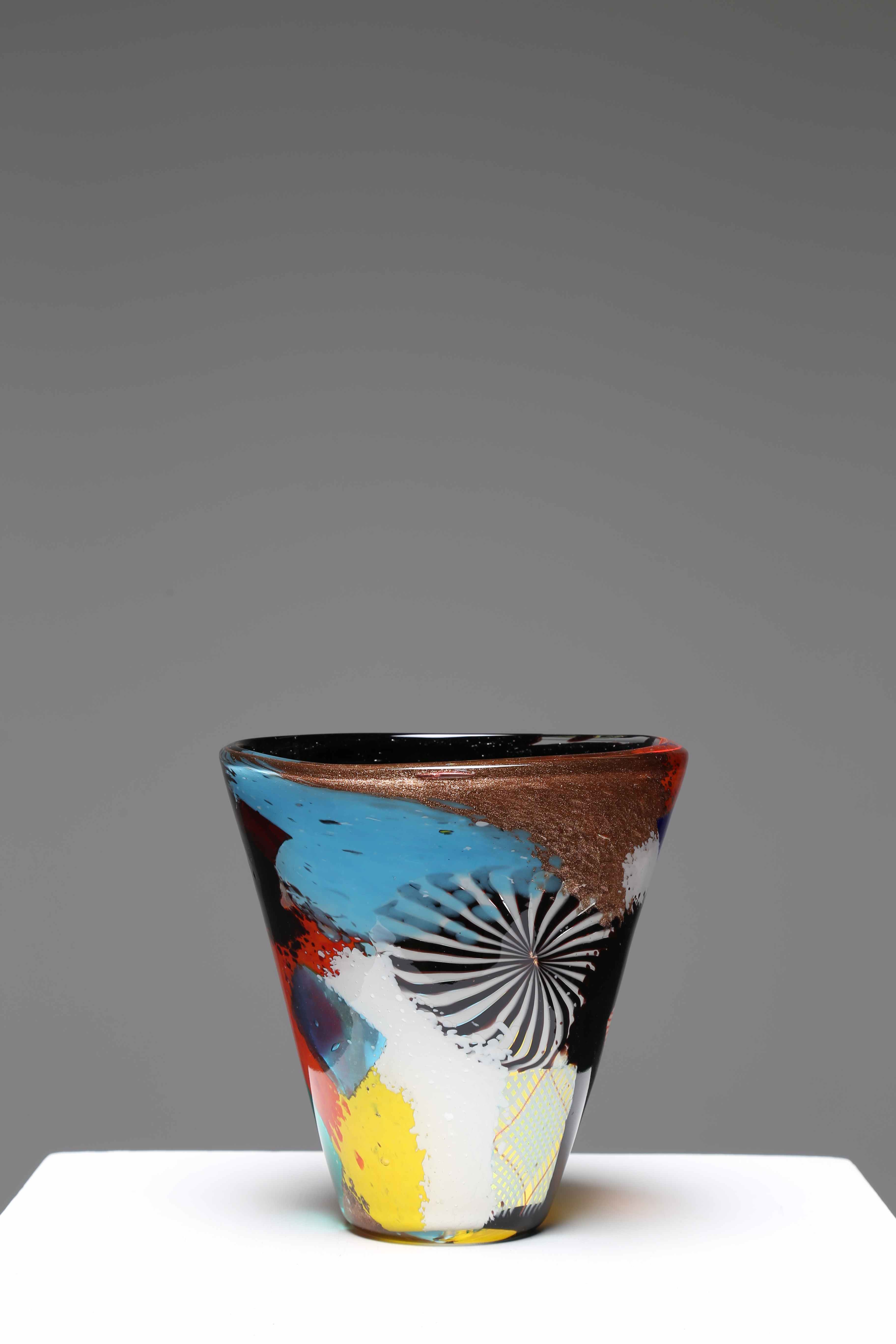 MARTENS DINO (1894 - 1970) Per Aureliano Toso. Importante Vaso in vetro a intarsio di colori vivaci della serie Oriente. 1955. Vetro di Murano. Cm 21,50 x 19,50 x 20,50. Etichetta Negozio Brusotti, Milano. Pubblicazione: Catalogo Generale Dino Martens - Muranese Glass Designer, Arnoldsche, 20TH Murano Glass.