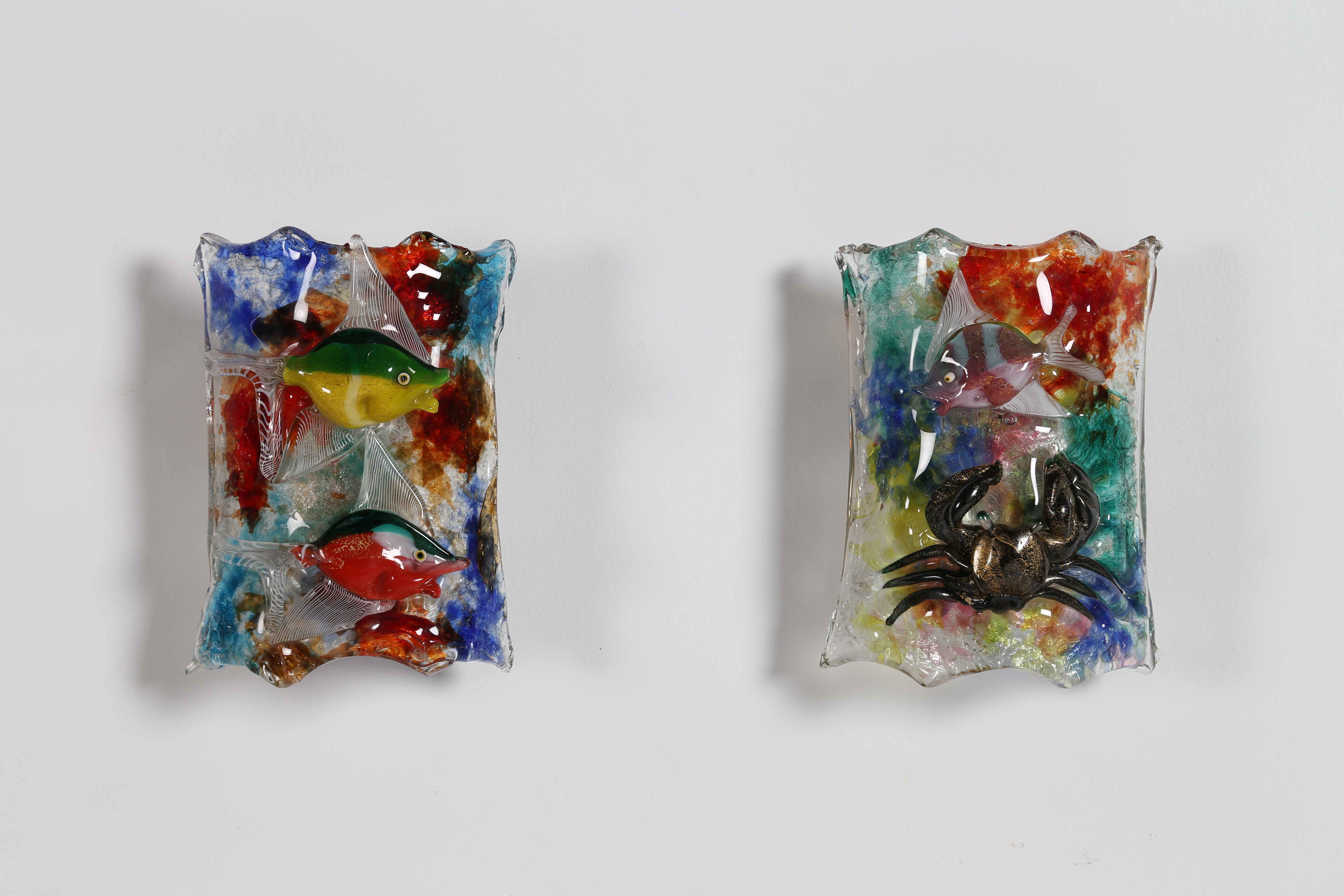 CENEDESE GINO Coppia di appliques vetro sommerso con pesci policromi. 1960....