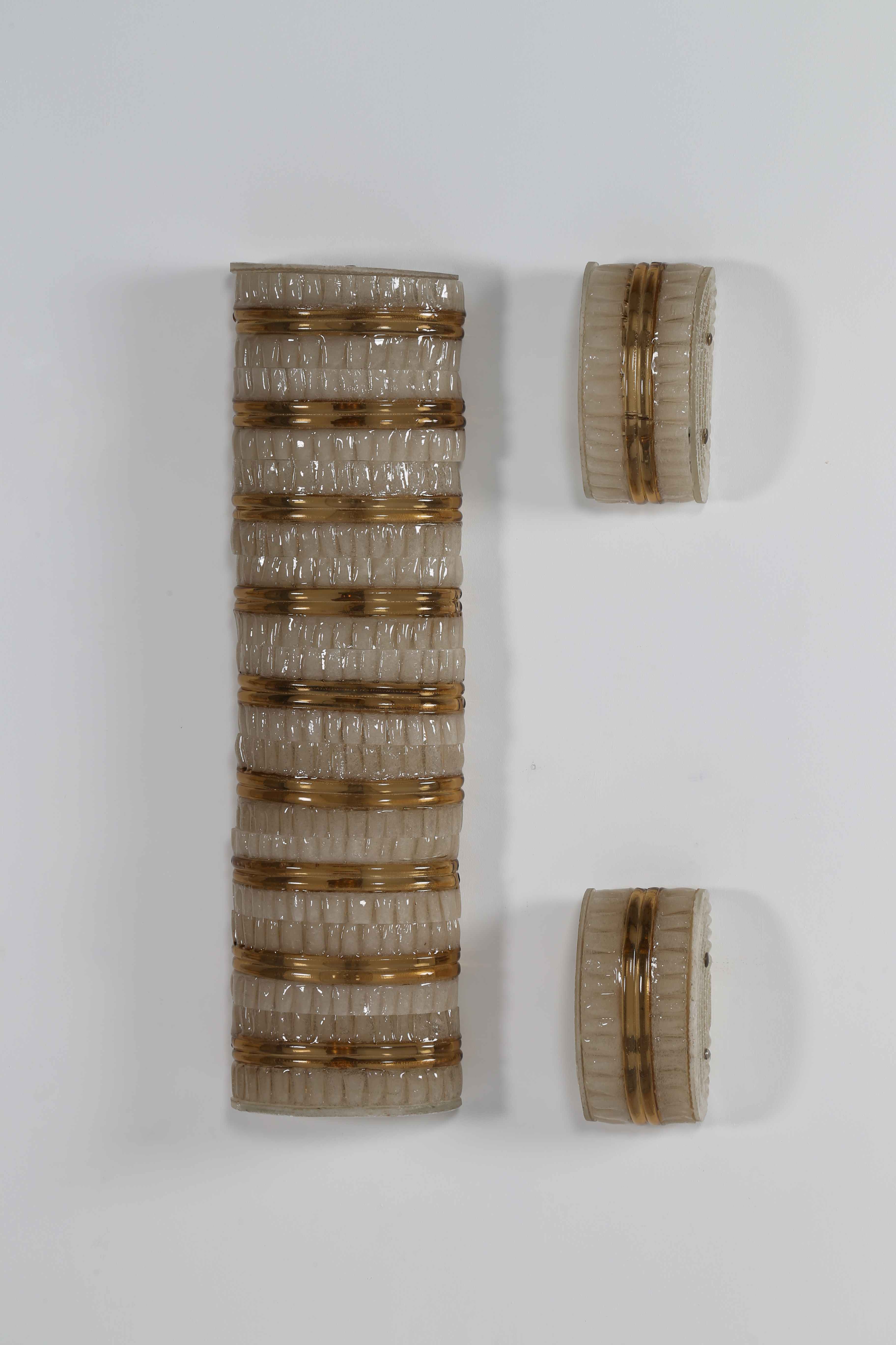 VENINI Lotto composto da n. 3 appliques in vetro pulegoso e cristallo ambra. Metallo e vetro. Cm 26,00 x 93,00 x 12,00. Dimensioni appliques piccole: 13x26x12 cm. Una delle applique presenta una crepa e una scheggiatura.
