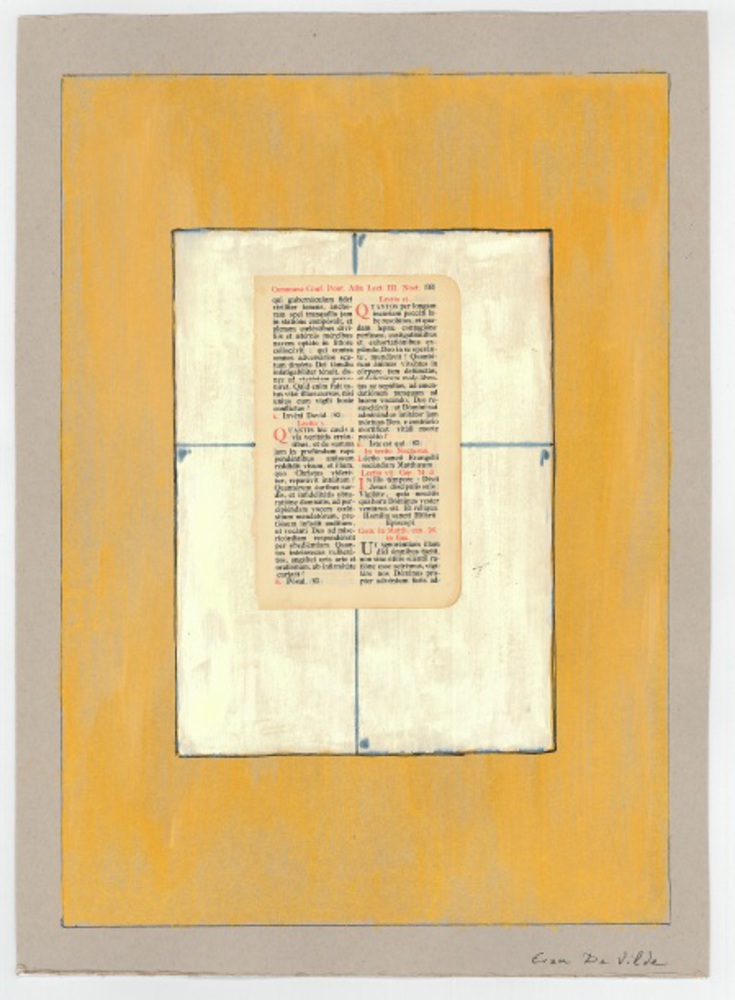 Evan De Vilde Ut, 2015, tecnica mista e collage su cartoncino con pagina di antico Breviarium Romanum (con autorizzazione ministeriale all'esportazioni definitiva), cm. 33,5x24, codice di archiviazione EAK 182
