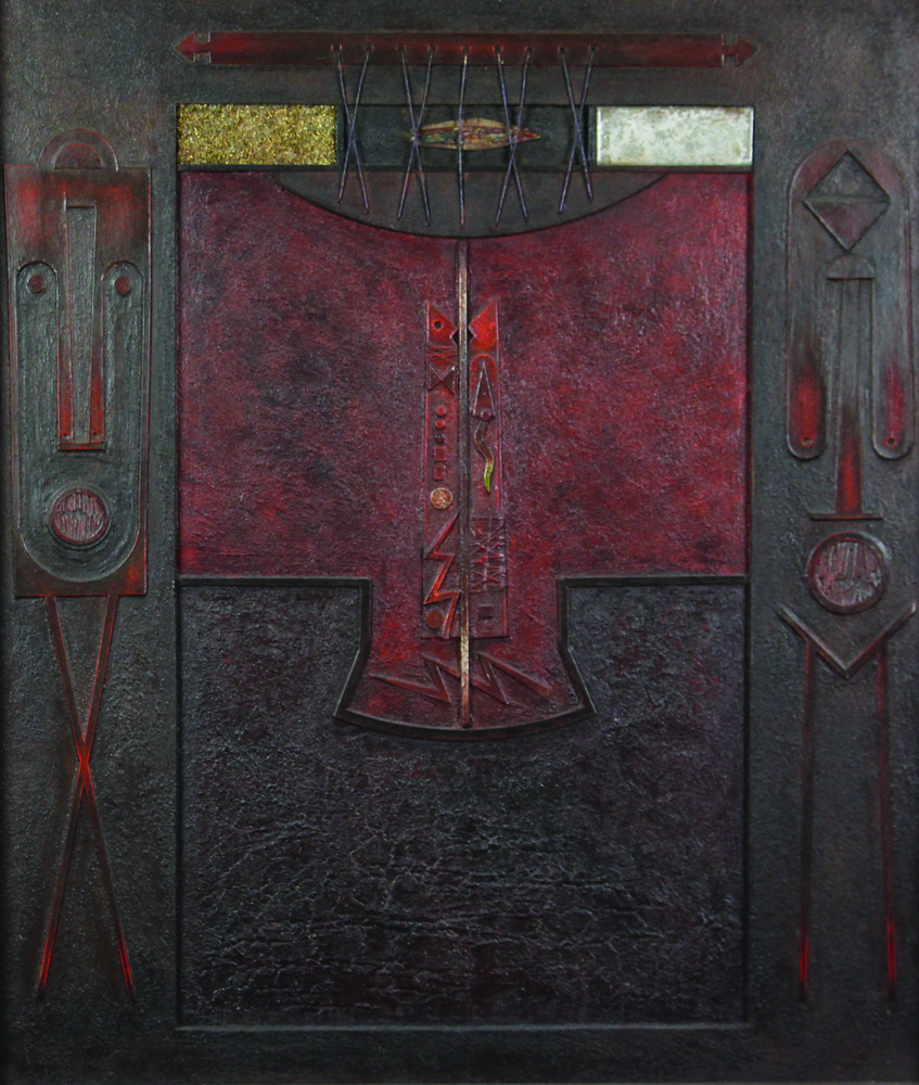 Antonio Caldarera La Mia Africa, 1995, tecnica mista e applicazioni su tavola, cm. 70x60, firmato, intitolato e datato al retro