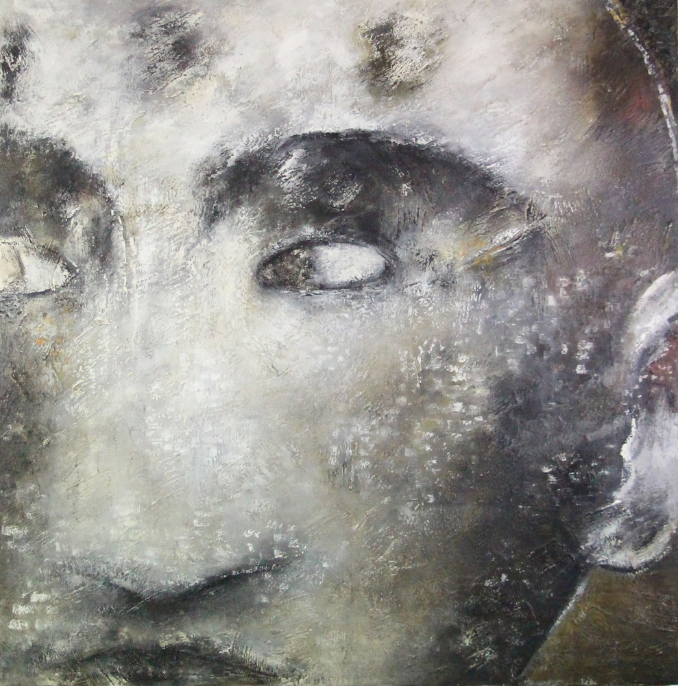 Miresi Studio n 8 per Inquisito/Inquisitore, 1993, olio e fusaggine su tela, cm. 100x100, firmato, intitolato e datato al retro della tela e del telaio, opera realizzata in occasione della mostra alla Galleria Giulia di Roma nel 1993, senza cornice