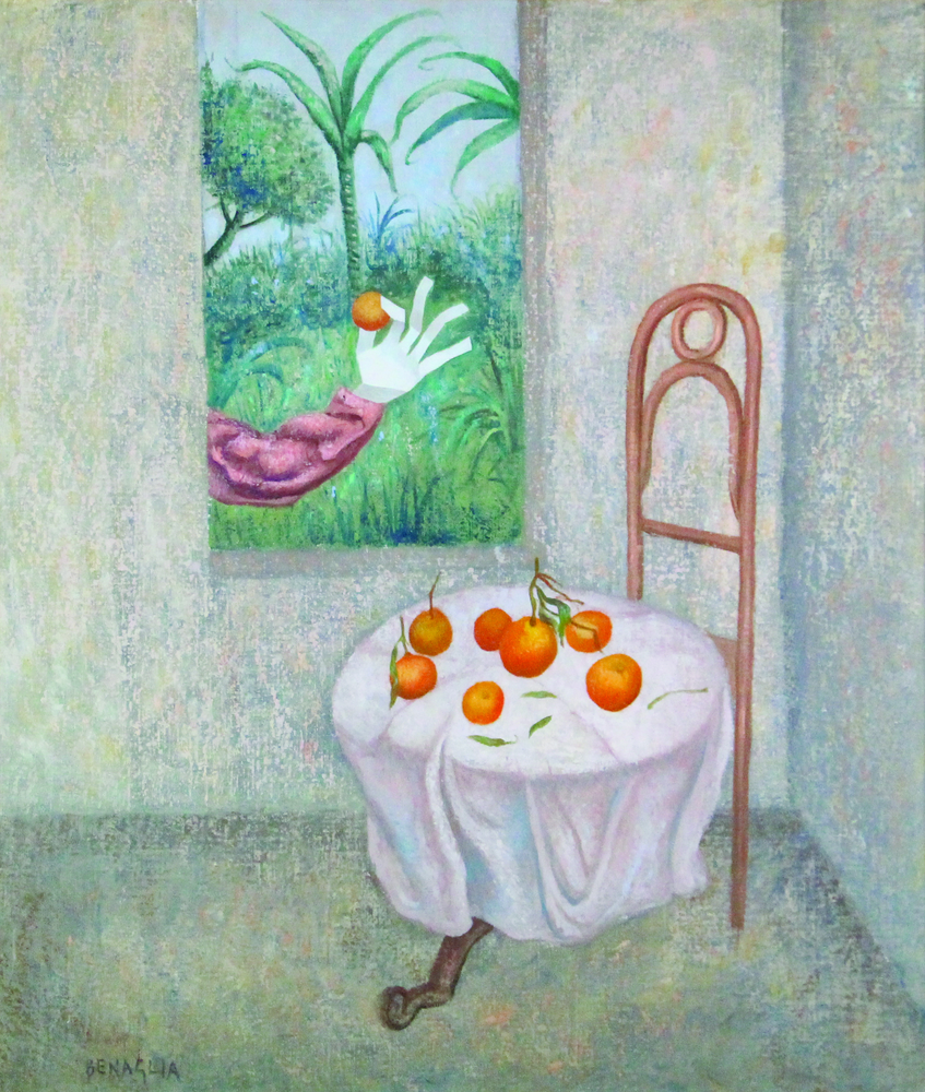 Enrico Benaglia La Merenda con le Mele d'Oro, 1982, acrilico su tela, cm. 70x60, firmato in basso a sinistra, firmato, intitolato e datato al retro