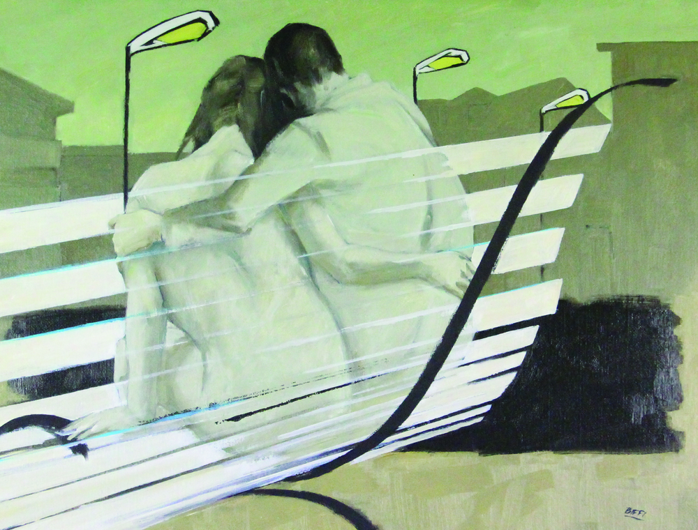 Luigi Biffi Gli Amanti di Milano, 1988, acrilico su tela di juta, cm. 60x80, firmato in basso a destra, firmato, intitolato e datato al retro