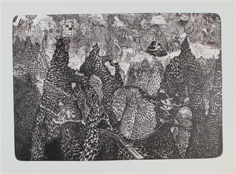 Stefano Pulga Biografia sulla pietra, 1977, neograffito da pietra azzurra di Baviera su carta, cm. 50x70, es. E. d. A. I/II, firmata in basso a destra, opera pubblicata sul catalogo "Antologia di uno stampatore. Cinque anni di lavoro in officina" a cura dell'Accademia Internazionale per la Grafica d'Arte, Stampera del Castello, Bologna