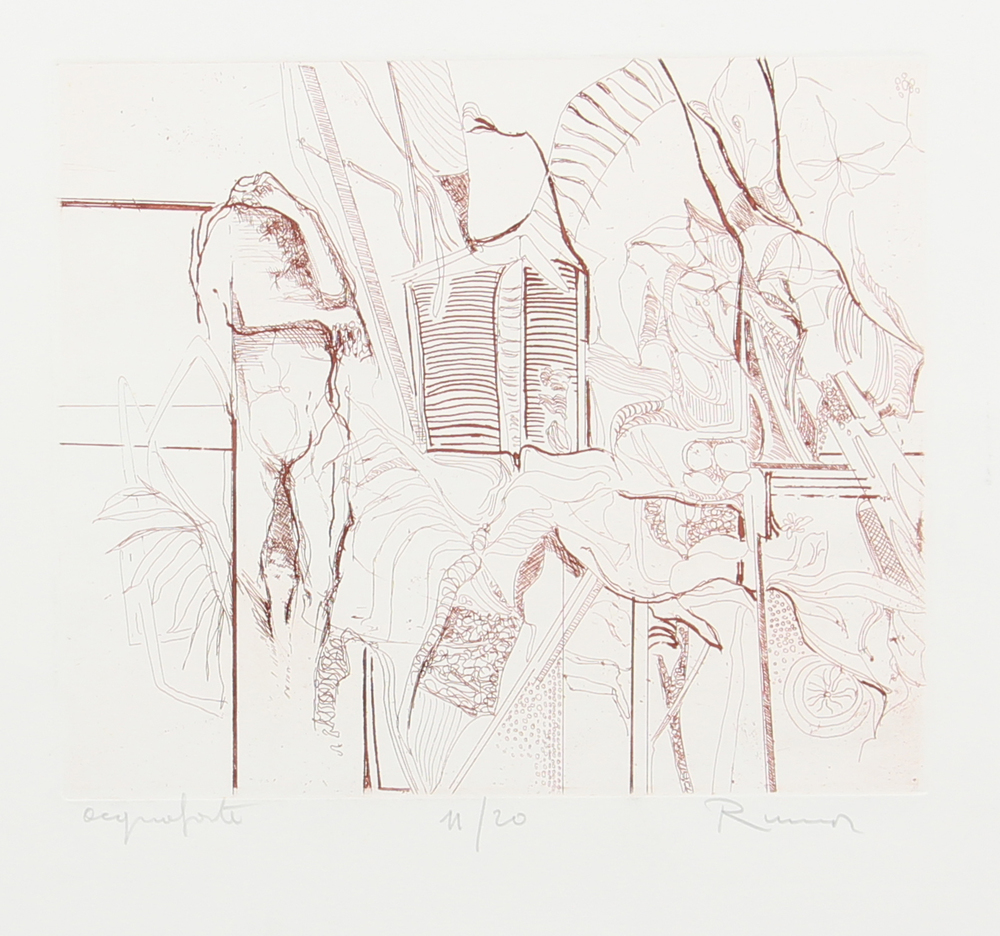 Ignoto Senza titolo, acquaforte su carta, cm. 59x49 (lastra cm. 23,5x27,5), es. 11/20, firma non decifrata in basso a destra, l'opera presenta tracce di umidità al margine inferiore e tracce di sporco al margine superiore, senza cornice