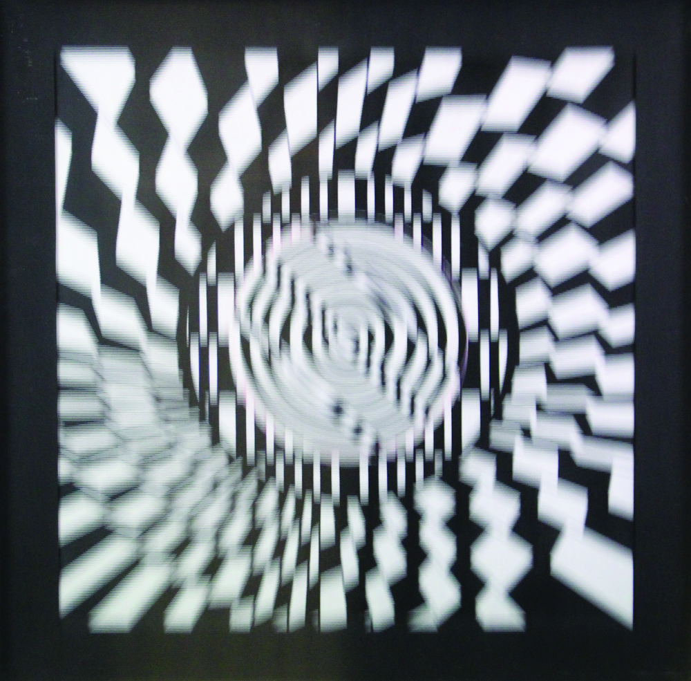 Guido Baldessari Nucleo Vibrante, 1969, tecnica mista su cartoncino (plexiglass zigrinato linee orizzontali), cm. 62x62, etichetta dell'Archivio Guido Baldessari di Venezia al retro, certificato di archiviazione dell'Archivio Guido Baldessari di Venezia
