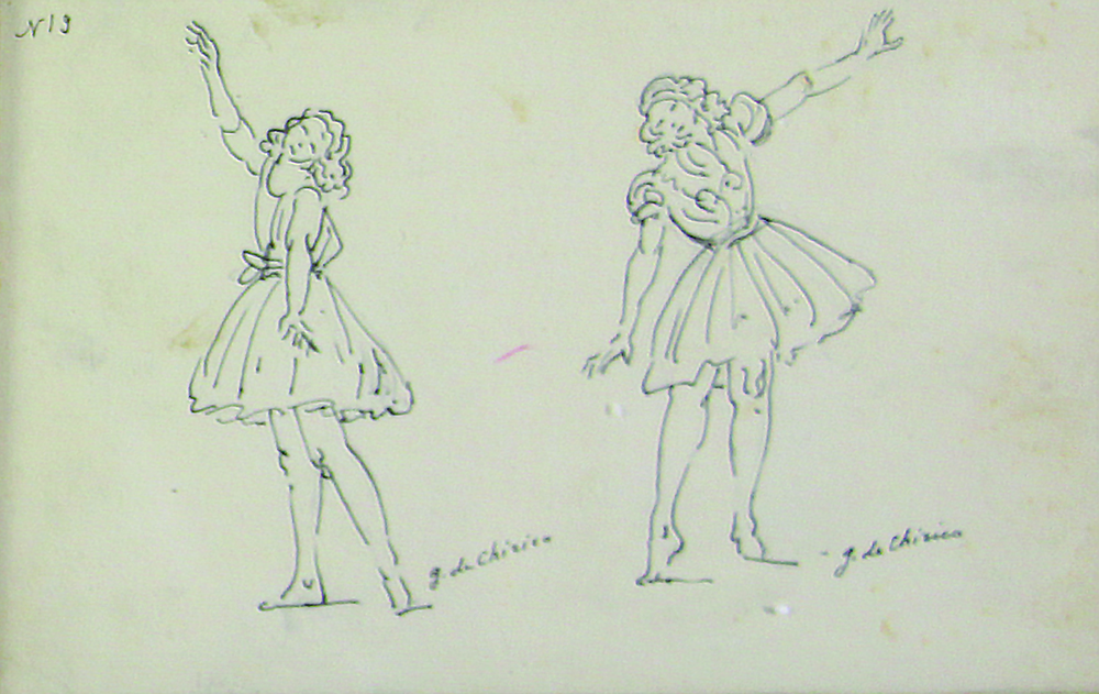 Giorgio De Chirico Danzatrici, meta' anni '50, penna su carta applicata su cartoncino, cm. 12x19 (con supporto cm. 14,5x21), firmato in basso a destra e al centro, certificato di archiviazione della Fondazione Giorgio e Isa De Chirico