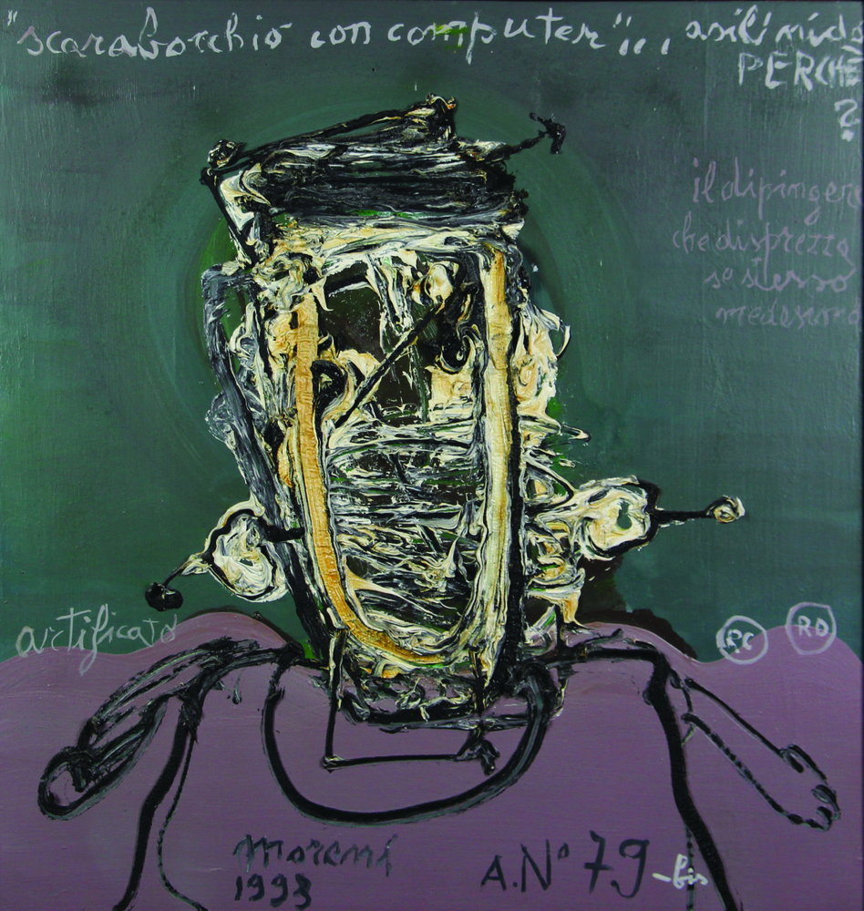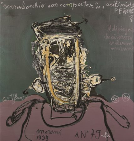 Mattia Moreni Autoritratto n. 79 bis "Scarabocchio con Computer". Il dipingere che disprezza se' stesso medesimo. Artificato. RC-RD: Asili Nido. PERCHE'?, 1993, colori su tavola, cm. 77x75, firmato e datato in basso al centro, certificato di atenticita' dell'artista su fotografia, opera pubblicata sul catalogo "Mattia Moreni", Villa Pacchiani, Santa Croce sull'Arno (PI) - Centro Attività Espressive, 15 Aprile - 9 Maggio 1995, p.75