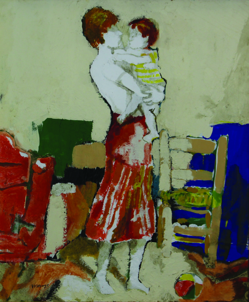 Morago Maternità, olio e tecnica mista su tela, cm. 60x50, firmato in basso a sinistra, etichetta dell'artista al retro