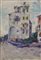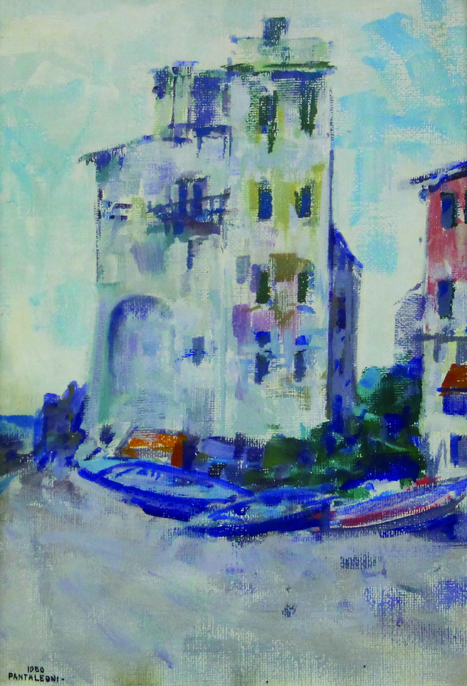 Ideo Pantaleoni Il Castello di Bogliasco (Genova), 1984, olio su tela grezza, cm. 50x35, firmato in basso a sinistra, firmato, intitolato, dedicato e datato al retro