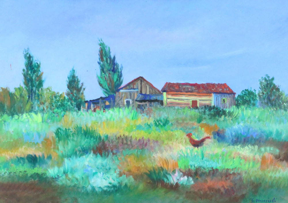 Giovanni Omiccioli Il Gallo nel Campo, 1966, olio su cartone, cm. 36,5x51, firmato in basso a destra, firmato e datato al retro, timbro dell'Archivio Giovanni Omiccioli al retro, certificato di archiviazione dell'Archivio Giovanni Omiccioli su fotografia