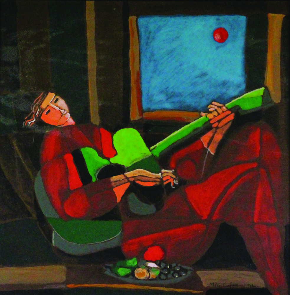 Mike C. Chitarra e Luna, 1992, acrilico su tavola, cm. 50x50, firmato e datato in basso a destra, firmato per autentica al retro