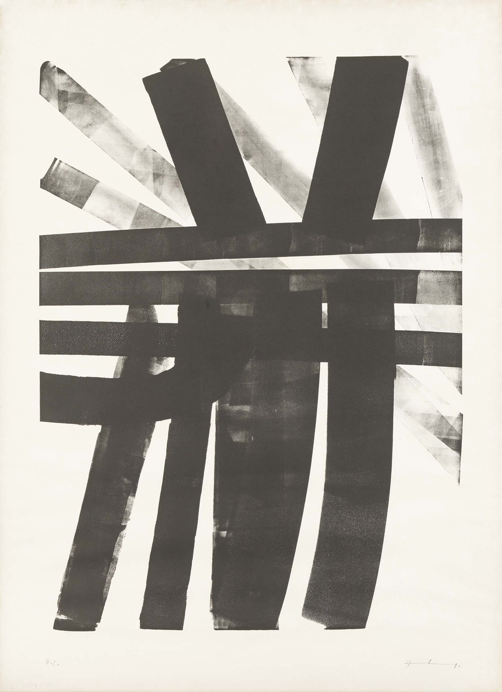 Hans Hartung, Lipsia 1904 - Antibes 1989, L 19, 1974, Litografia, es. H.C., cm. 104x75,5, Firma a matita sul margine in basso a destra: Hartung, tiratura in basso a sinistra: H.C: sigla L - 1974 19: timbro a secco Erker Presse / St. Gallen.,