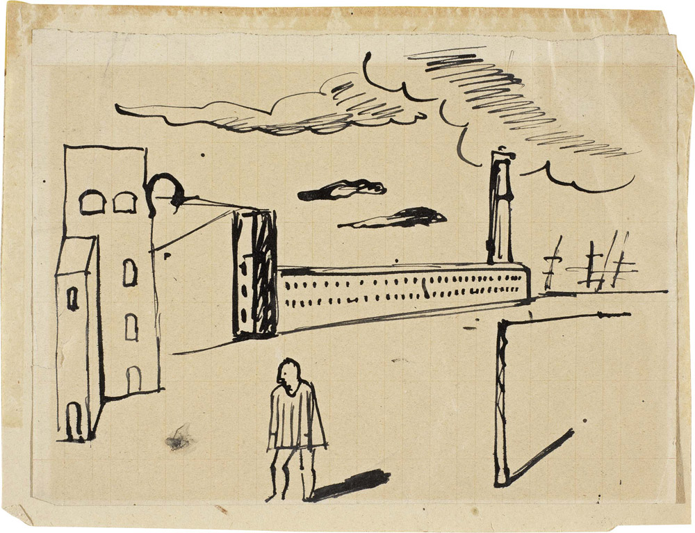 Mario Sironi, Sassari 1885 - Milano 1961, Periferia, Inchiostro su carta, cm. 15,5x21