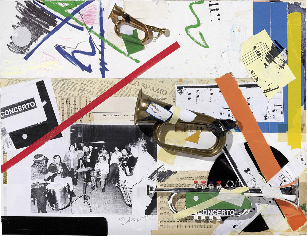 Giuseppe Chiari, Firenze 1926 - 2007, Trumpet, 2000, Assemblaggio di strumenti musicali e collage su tavola, in teca di plexiglass, cm. 66x86x13,5 (teca), Firma in basso al centro: Chiari; titolo, data e firma su uno strumento: Trumpet / Chiari / 2000. Al verso: timbro Armanda Gori Arte, Prato., Certificato su foto Armanda Gori Arte, Prato., Bibliografia: Giuseppe Chiari musica e segno 2-3, Gli Ori, Prato, 2007, p. 104.,
