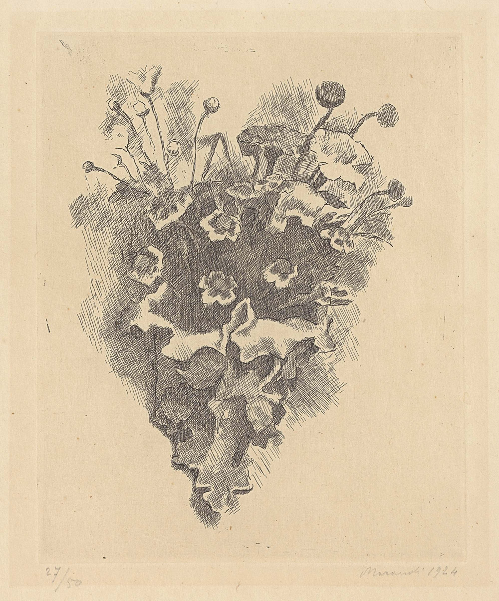 Giorgio Morandi, Bologna 1890 - 1964, Cornetto con fiori di campo, 1924, Acquaforte su zinco, es. 27/50, cm. 20,3x16,2 (lastra), cm. 28,8x22,8 (carta), Firma e data a matita sul margine in basso a destra: Morandi 1924, tiratura in basso a sinistra: 27/50., Storia: Collezione Giancarlo Pasi, Ravenna, Primo stato su due; tiratura di 50 esemplari, di cui alcuni non numerati e alcuni su carta Giappone., Bibliografia: Lamberto Vitali, L'opera grafica di Giorgio Morandi, Giulio Einaudi Editore, Torino, 1964, n. 22;, Michele Cordaro, Morandi incisioni. Catalogo Generale, Edizioni Electa, Milano, 1991, p. 23, n. 1924 2.,