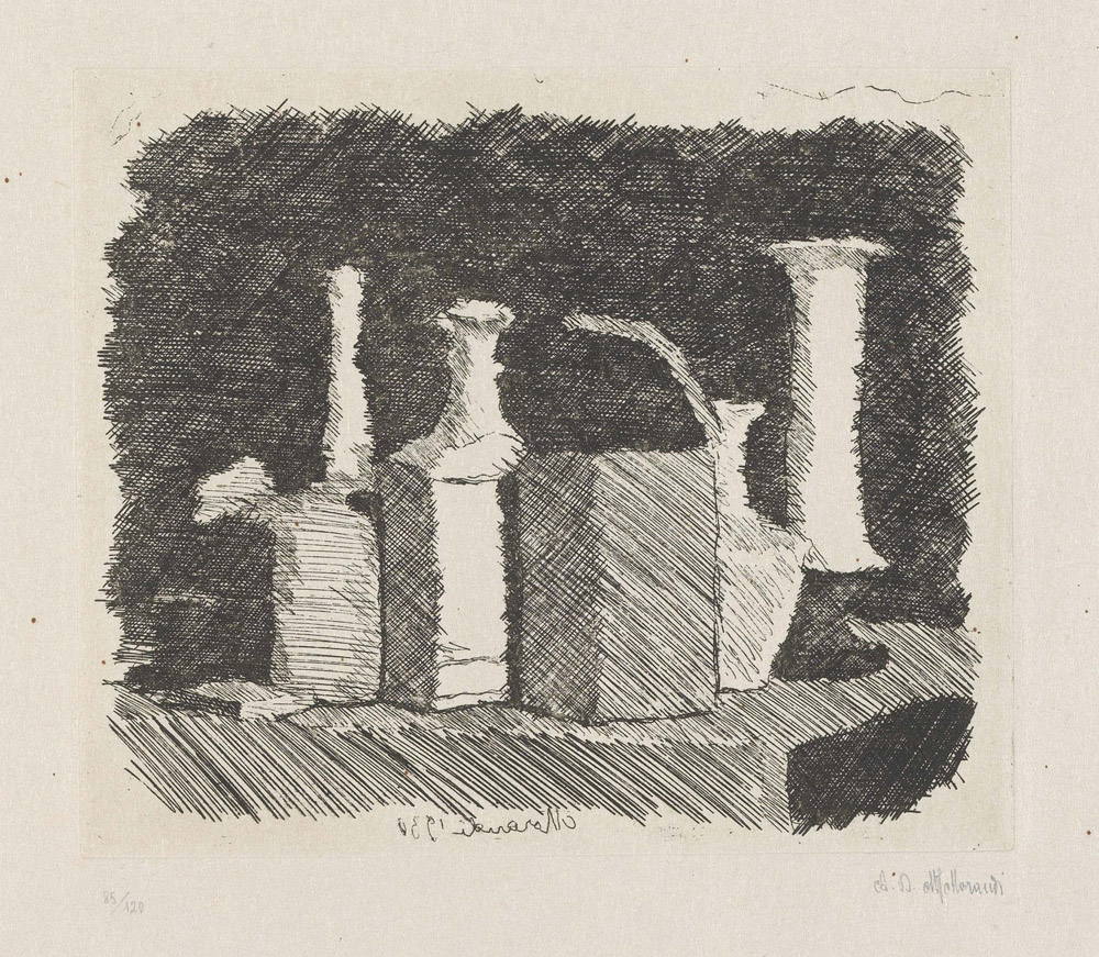 Giorgio Morandi, Bologna 1890 - 1964, Natura morta con sei oggetti, 1930, Acquaforte su rame, es. 85/120, cm. 19,8x23,7 (lastra), cm. 33x47,7 (carta), Firma e data in lastra in basso al centro: Morandi 1930 (speculare), tiratura a matita sul margine in basso a sinistra: 85/120, sigla delle sorelle Morandi a matita sul margine in basso a destra: A. D. MT. Morandi. Al verso, su un cartone di supporto: etichetta Galleria d'Arte Maggiore, Bologna., Storia: Collezione Giancarlo Pasi, Ravenna, Stato unico, tiratura di un esemplare non numerato e tiratura postuma su carta Giappone numerata e firmata dalle sorelle dell'artista comprendente 6 prove di stampa, 3 esemplari segnati a, b, c, 10 esemplari segnati da I/X a X/X e 120 esemplari numerati da 1/120 a 120/120 destinati al volume 50 acquarelli di Giorgio Morandi, edito a Torino nel 1963., Bibliografia: Lamberto Vitali, L'opera grafica di Giorgio Morandi, Giulio Einaudi Editore, Torino, 1964, n. 124;, Michele Cordaro, Morandi incisioni. Catalogo Generale, Edizioni Electa, Milano, 1991, p. 88, n. 1930 10.,