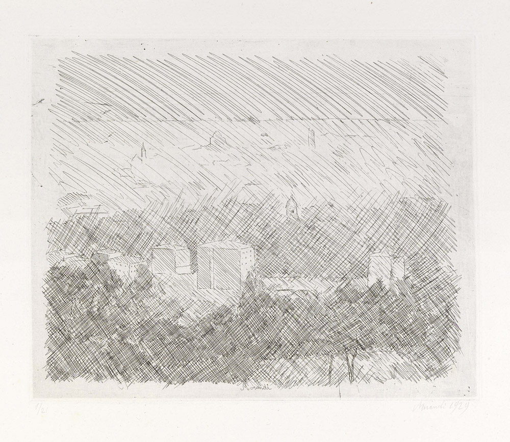 Giorgio Morandi, Bologna 1890 - 1964, Paesaggio (Pianura di Bologna), 1929, Acquaforte su zinco, es. 1/21, cm. 24,7x30,2 (lastra), cm. 42x55,6 (carta), Firma in lastra in basso al centro: Morandi, firma e data a matita sul margine in basso a destra: Morandi 1929, tiratura in basso a sinistra: 1/21, timbro a secco Finarte, Eredità Morandi 1996., Storia: Collezione Giancarlo Pasi, Ravenna, Secondo stato su tre, tiratura di 21 esemplari numerati e qualche prova di stampa in parte su carta India incollata., Bibliografia: Lamberto Vitali, L'opera grafica di Giorgio Morandi, Giulio Einaudi Editore, Torino, 1964, n. 54;, Michele Cordaro, Morandi incisioni. Catalogo Generale, Edizioni Electa, Milano, 1991, p. 62, n. 1929 2.,