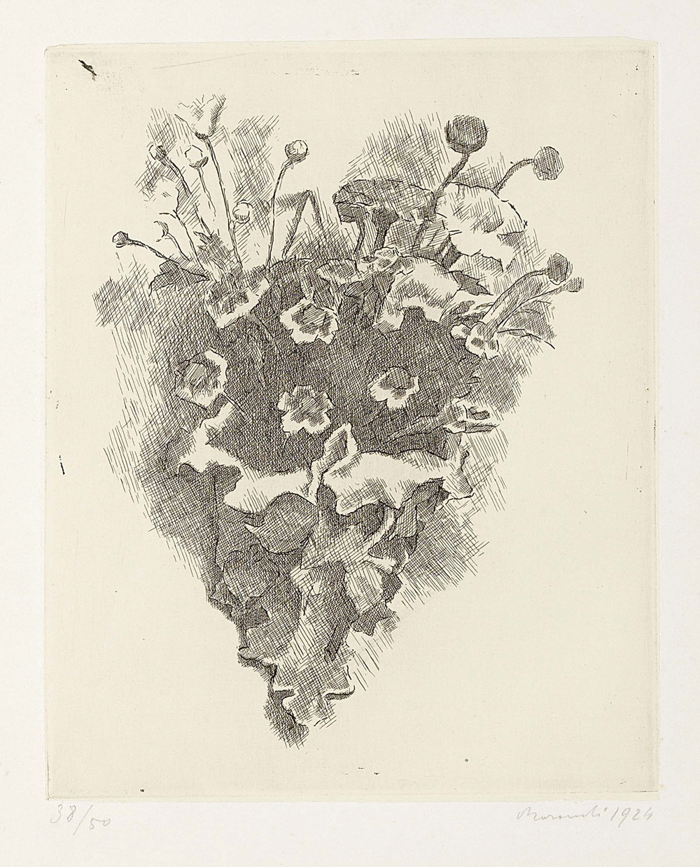 Giorgio Morandi, Bologna 1890 - 1964, Cornetto con fiori di campo, 1924, Acquaforte su zinco su carta India incollata, es 38/50, cm. 20,4x16,3 (lastra), cm. 44,1x28,2 (carta), Firma e data a matita sul margine in basso a destra: Morandi 1924, tiratura in basso a sinistra: 38/50, timbro a secco Libreria Prandi, Reggio Emilia; al verso: timbro Galleria del Milione, Milano, con n. 7435/1., Storia: Collezione Giancarlo Pasi, Ravenna, Primo stato su due, tiratura di 50 esemplari, di cui alcuni non numerati., Bibliografia: Lamberto Vitali, L'opera grafica di Giorgio Morandi, Giulio Einaudi Editore, Torino, 1964, n. 22;, Michele Cordaro, Morandi incisioni. Catalogo Generale, Edizioni Electa, Milano, 1991, p. 23, n. 1924 2.,