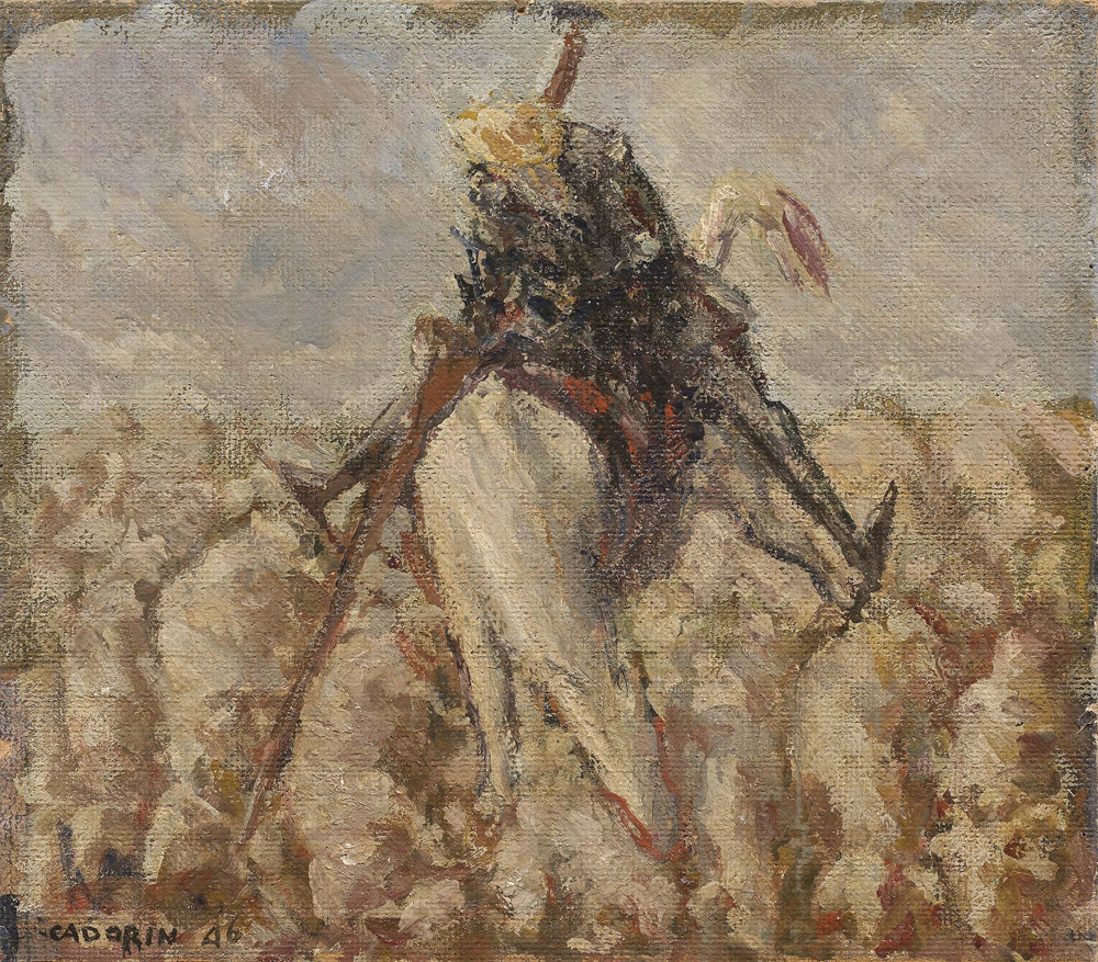 Guido Cadorin, Venezia 1892 - 1975, Don Quijote all'assalto di un gregge, 1946, Olio su faesite, cm. 45x49, Firma e data in basso a sinistra: Cadorin 46. Al verso: scritta con dati dell'opera.,