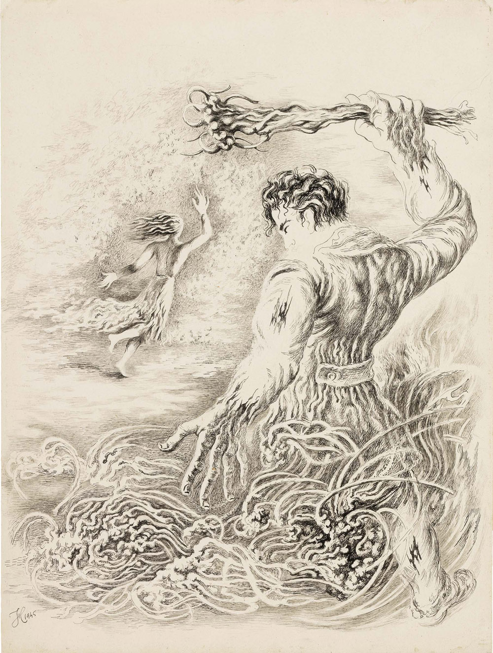 Fabrizio Clerici, Milano 1913 - Roma 1993, Senza titolo, 1945, China su cartoncino, cm. 32x24, Monogramma e data in basso a sinistra: FC 1945., Eseguito nel 1945 per "Leviathan" di Julien Green, otto illustrazioni di Fabrizio Clerici, Arnoldo Mondadori Editore, Milano, 1946.,