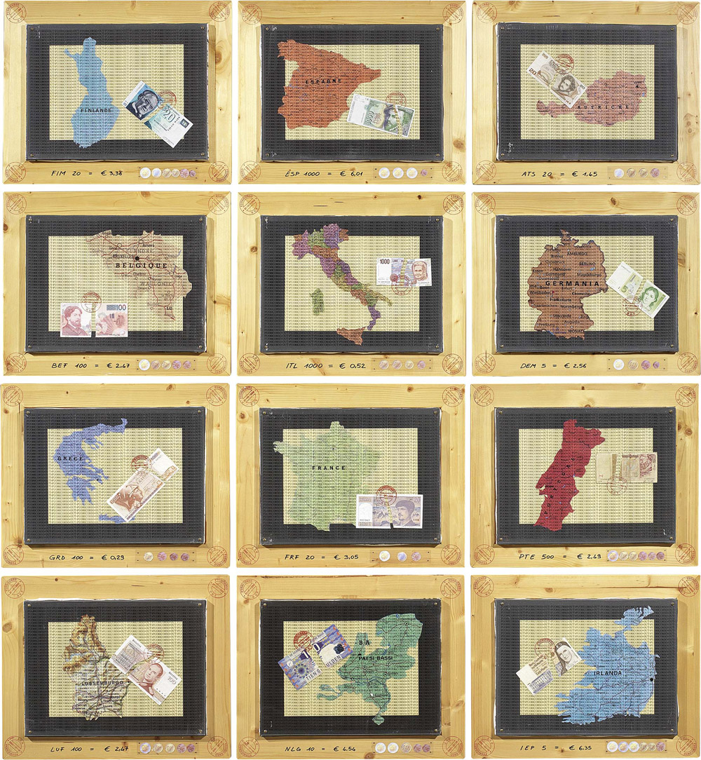 Mimmo Rotella, Catanzaro 1918 - Milano 2006, Fuoricorso, 2002, Tecnica mista, collage, carta, e plexiglass su tela, 12 elementi, es. 6/8, cm. 41x50,7 ognuno, Firma e tiratura su ogni banconota: Rotella / 6/8., Foto autenticate dall'artista., Esposizioni: "Fuoricorso" by Mimmo Rotella, Mostra collaterale Samarcanda - 14 Mostra di Antiquariato, Montichiari (Brescia), Centro Fiera del Garda, 26 gennaio - 3 febbraio 2002, illustrati sul pieghevole della mostra., Tiratura di 8 esemplari e due prove d'artista.,