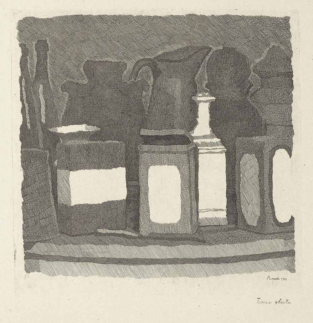 Giorgio Morandi, Bologna 1890 - 1964, Natura morta, 1933, Acquaforte su zinco, cm. 23,8x24,3 (lastra), cm. 30x38 (carta) Firma e data in lastra in basso a destra: Morandi 1933, scritta a matita sul margine in basso a destra: terzo stato, in basso a sinistra: timbro a secco Finarte, Eredità Morandi 1996. Terzo stato su quattro, tiratura di 3 esemplari. Bibliografia, Lamberto Vitali, L'opera grafica di Giorgio Morandi, Giulio Einaudi Editore, Torino, 1964, n. 100;, Michele Cordaro, Morandi incisioni. Catalogo Generale, Edizioni Electa, Milano, 1991, p. 114, n. 1933 2.