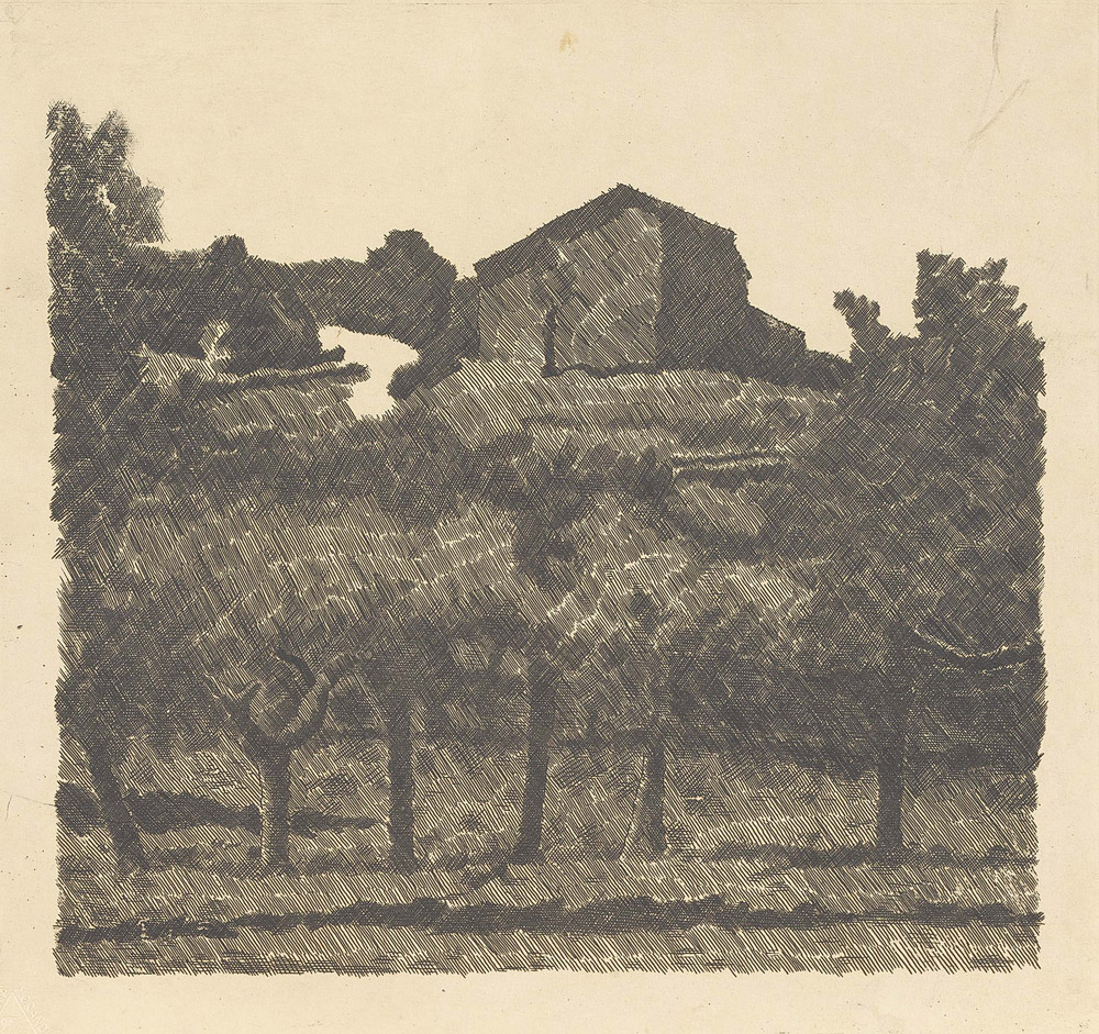 Giorgio Morandi, Bologna 1890 - 1964, Paesaggio di Grizzana, le Lame, 1931, Acquaforte su rame, cm. 23,6x24,8 (lastra), cm. 24,6x26,5 (carta) Timbro a secco in basso a sinistra: Finarte, Eredità Morandi 1996. Primo stato su tre, tiratura di tre esemplari. Bibliografia, Lamberto Vitali, L'opera grafica di Giorgio Morandi, Giulio Einaudi Editore, Torino, 1964, n. 89;, Michele Cordaro, Morandi incisioni. Catalogo Generale, Edizioni Electa, Milano, 1991, p. 100, n. 1931 8.