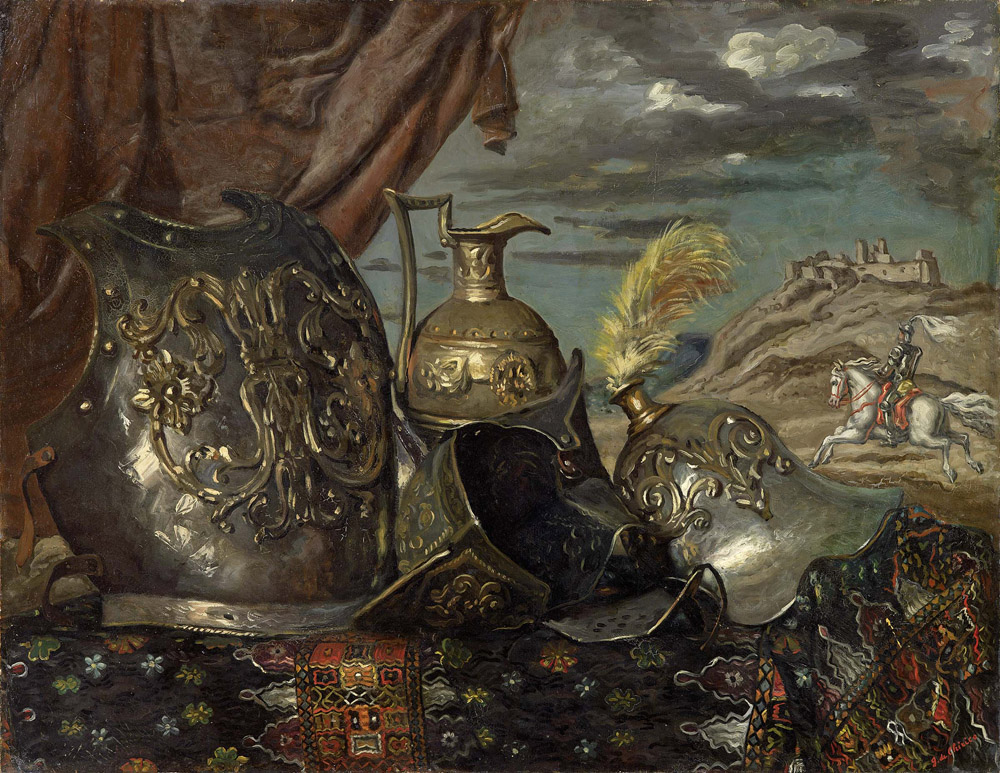 Giorgio de Chirico, Volos 1888 - Roma 1978, Corazze con cavaliere (Natura morta ariostesca), 1940, Olio su tela, cm. 87,5x112 Firma in basso a destra: G. de Chirico; titolo e firma al verso sulla tela: "Corazze con cavaliere" / Giorgio de Chirico: dichiarazione di autenticità del notaio Diego Gandolfo, Roma, 12 marzo 1964, rep. n. 147625: timbro Galleria d'Arte Medea, Milano: due timbri Galleria Gissi, Torino: etichetta Galleria Gissi, Torino / Dicembre 1973 - Gennaio 1974 / Mostra Protagonisti del XX secolo, con titolo Natura morta ariostesca e n. 5483; sul telaio: etichetta Galleria d'Arte Martina, Torino. Storia, Collezione Rossi, Milano;, Collezione privata, Firenze;, Collezione privata Bibliografia, Claudio Bruni Sakraischik, Catalogo Generale Giorgio de Chirico, volume terzo, opere dal 1931 al 1950, Electa Editrice, Milano, 1973, n. 240;, Vita silente, Giorgio de Chirico dalla Metafisica al Barocco, Skira editore, Milano, 1997, p. 39, tav. c;, Giorgio de Chirico dalla Metafisica alla «Metafisica», opere 1909-1973, Marsilio, Venezia, 2002, p. 37.