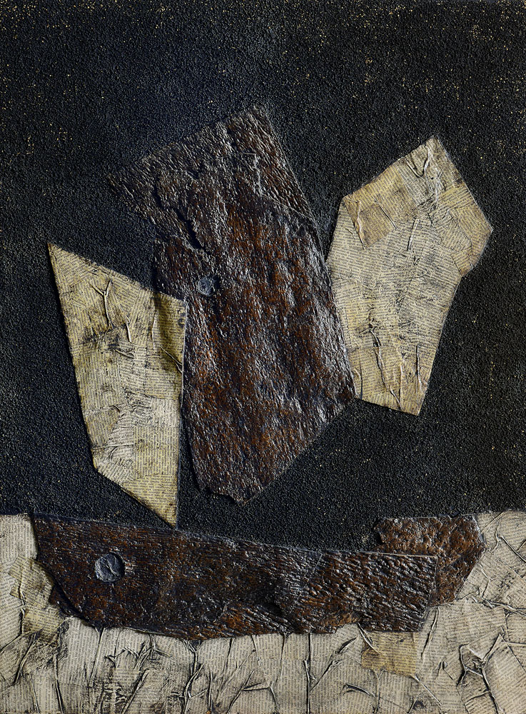 tecnica mista, collage e sughero su tavola cm 90x60, firma, titolo, anno, etichetta della Galleria Annunciata (MI) e dichiarazione d'autenticità di Rosangela Baggini al retro, dichiarazione d'autenticità e archivio a cura di Roberto Crippa Jr. su foto.