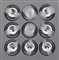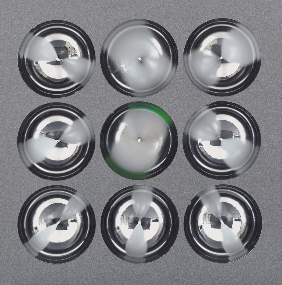 assemblaggio di materie plastiche (9 semisfere in metacrilato) cm. 47x47x8, firma, anno e titolo al retro, dichiarazione d'autenticità dell'artista e timbro della Anti: galleria d'arte contemporanea (Mestre-VE) su foto.