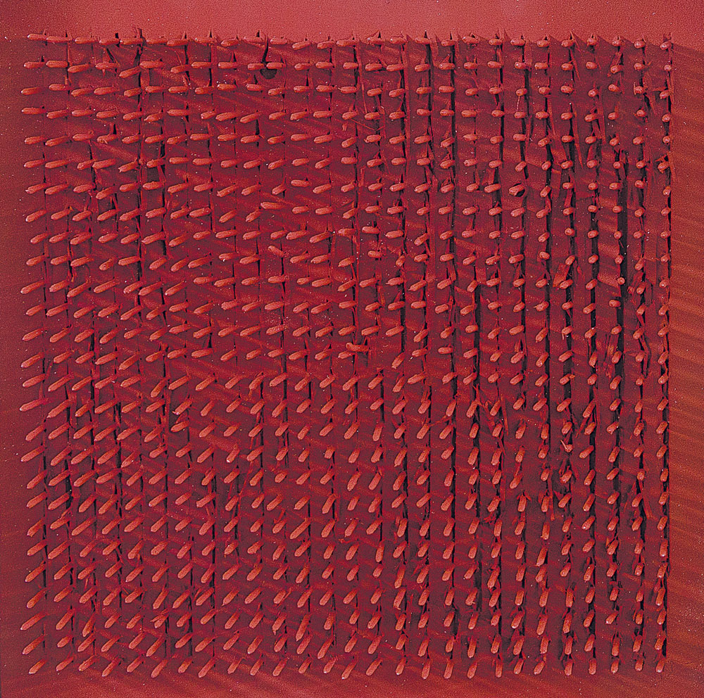 acrilici e chiodi su tavola cm. 30x30, firma e anno al retro, dichiarazione d'autenticità dell'artista e timbro a secco dell'Archivio Aubertin su foto, opera registrata presso l'Archivio Opere Bernard Aubertin (BS) come da dichiarazione su certificato allegato.