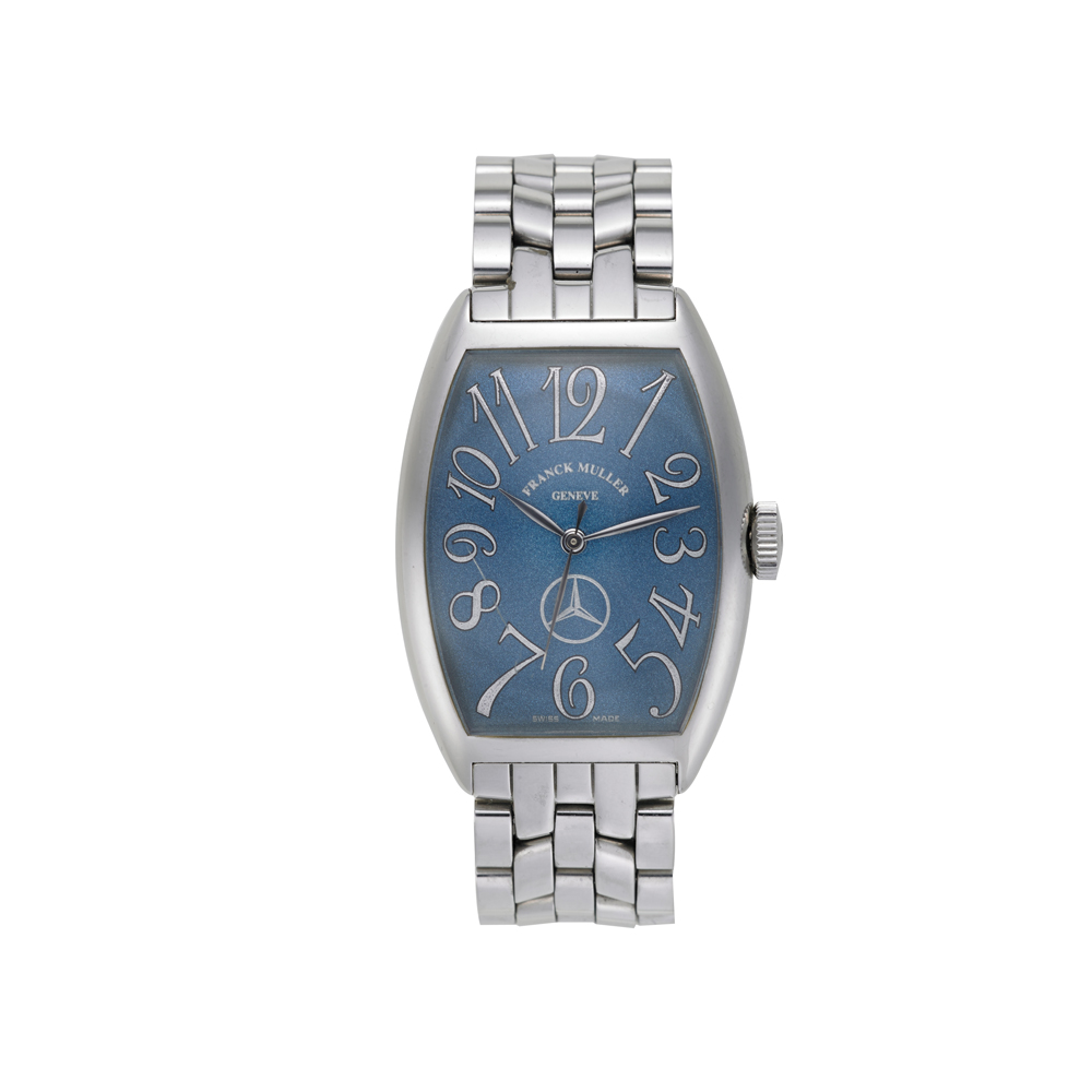 FRANCK MULLER mod. HAVANA Orologio da polso da uomo in acciaio Anni 1990 ca. Quadrante, movimento e cassa firmati Movimento con carica automatica Quadrante color azzurro con cifre arabe e logo della Mercedes a ore sei Serie limitata n.23, ref. n.5850 Misura 32x45mm Con scatola FRANCK MULLER mod. HAVANA Men's steel wristwatch Automatic-wind movement Blue dial with Arabic numerals and Mercedes logo With box