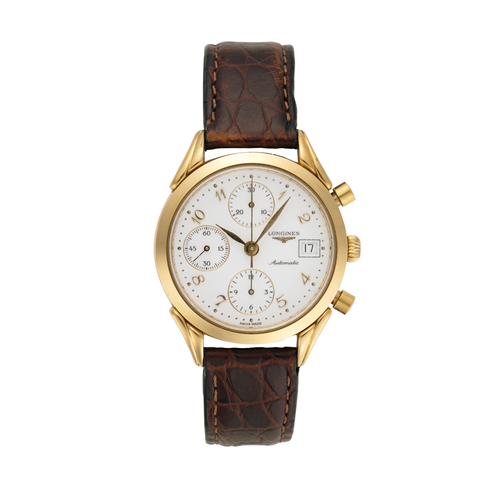 LONGINES CRONOGRAFO Orologio da polso da uomo laminato Epoca anni '90 Quadrante movimento e cassa firmati Movimento con carica automatica per ore, minuti e secondi Quadrante bianco con cifre arabe e piccoli quadranti ausiliari Cassa n. 27475344 Diam. mm 36 LONGINES Men's laminated wristwatch Automatic-wind movement, chronograph White dial with Arabic numerals