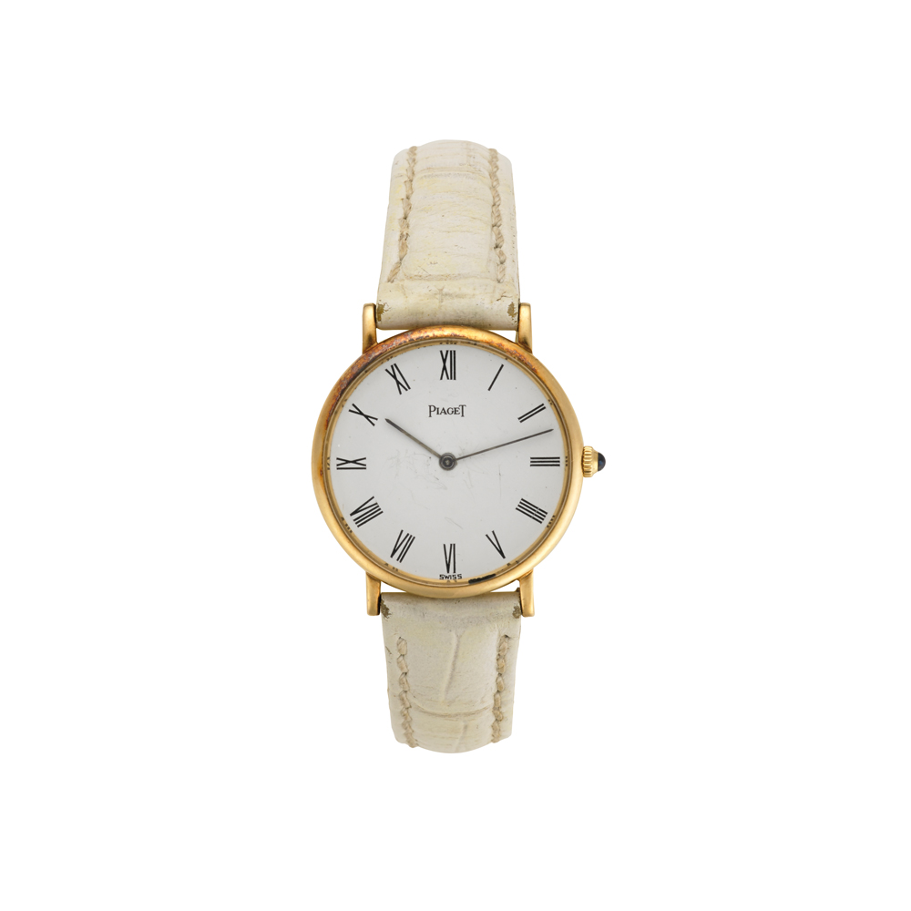PIAGET Orologio da polso da donna in oro 18 K Epoca anni '80 Quadrante, movimento e cassa firmati Movimento con carica manuale Quadrante bianco con cifre romane Cassa n. 9015-263864 Diam. mm 27 PIAGET Lady's gold wristwatch Manual-wind movement White dial with Roman numerals