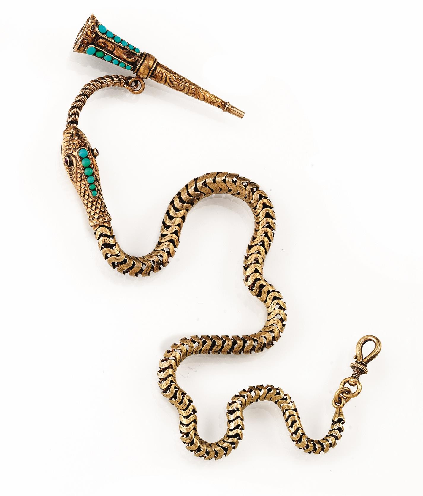 modellata come un serpente con testa e sigillo pendente decorato in turchesi, 38 g un turchese mancante