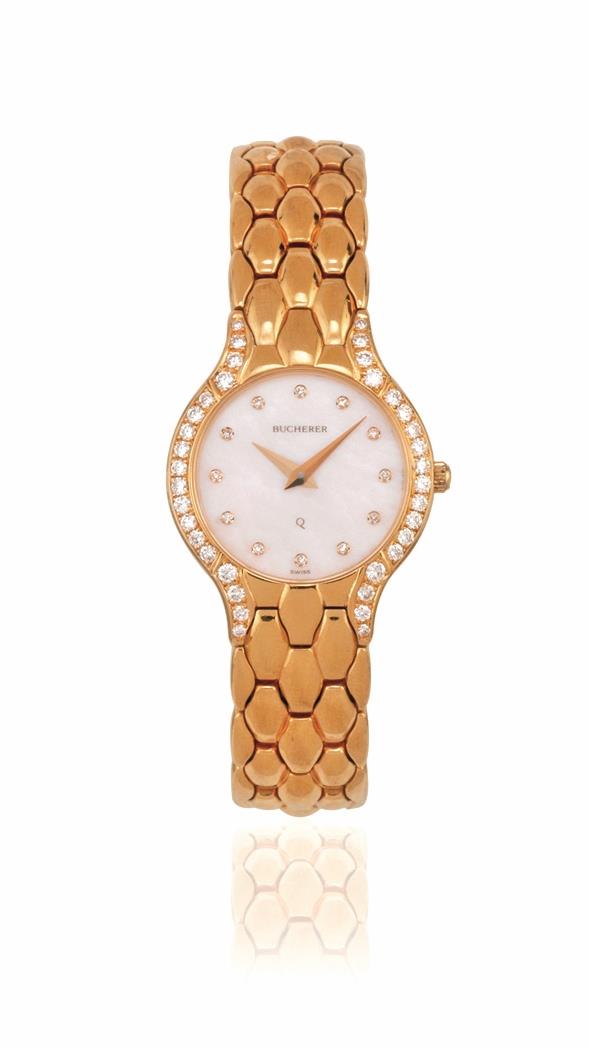 OROLOGIO DA POLSO PER SIGNORA BUCHERER, REF. 1141/1, SERIALE N.256-050, IN ORO GIALLO, MADREPERLA E DIAMANTI