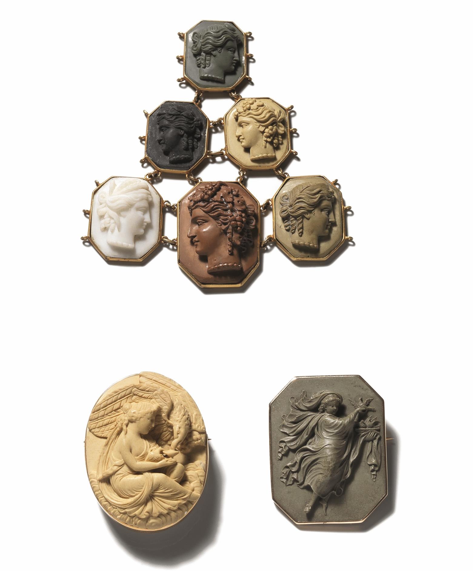 l'elemento è costituito da sei cammei con profilo ottagonale raffiguranti figure mitologiche e profili muliebri; la spilla pendente di forma ovale con cammeo in pietra lavica raffigurante Ganimede con acquila e spilla ottagonale con figura allegorica con colomba della pace
