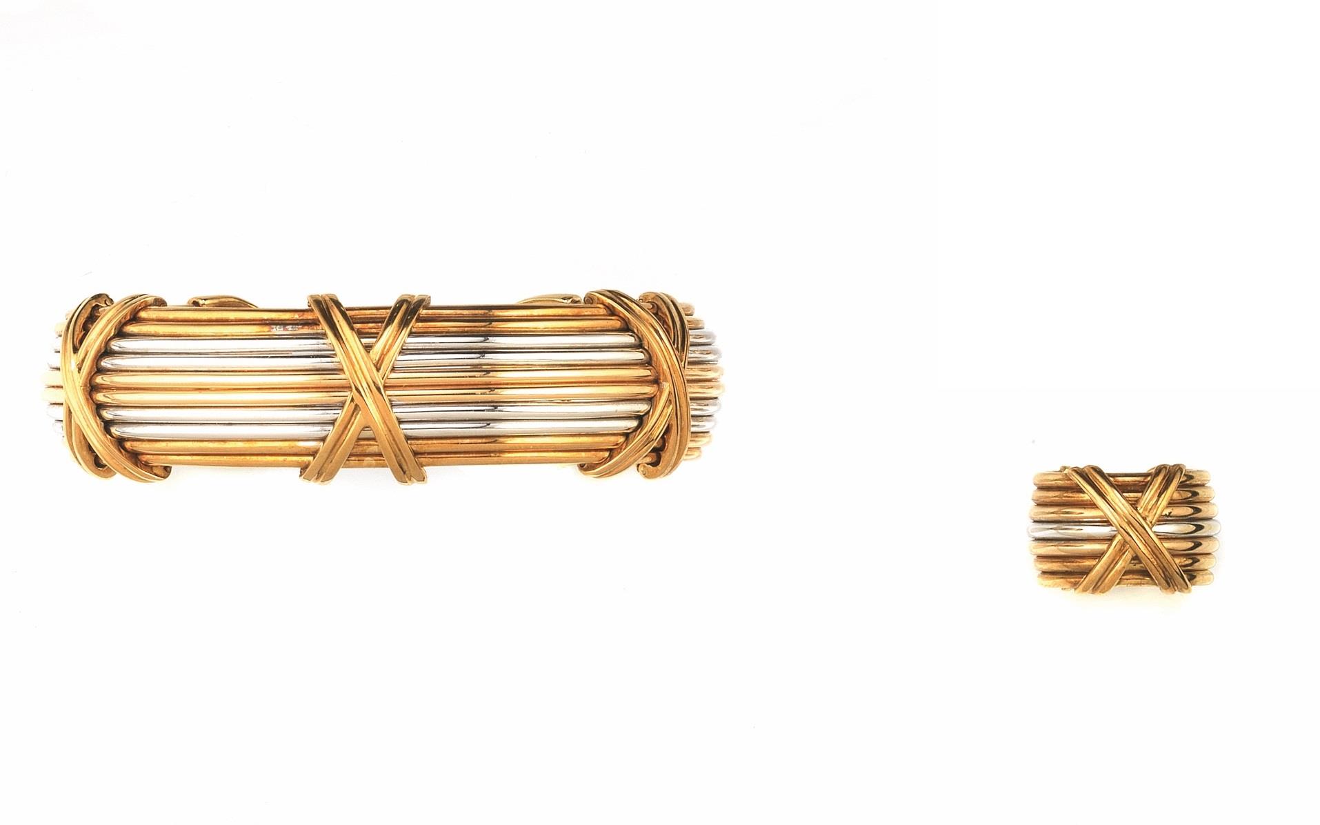 il bracciale realizzato in oro dei tre colori e decorato da motivi a croce en suite con la colllana, punzone 750, 66 g; l'anello en suite con il bracciale, punzone 750, 20 g