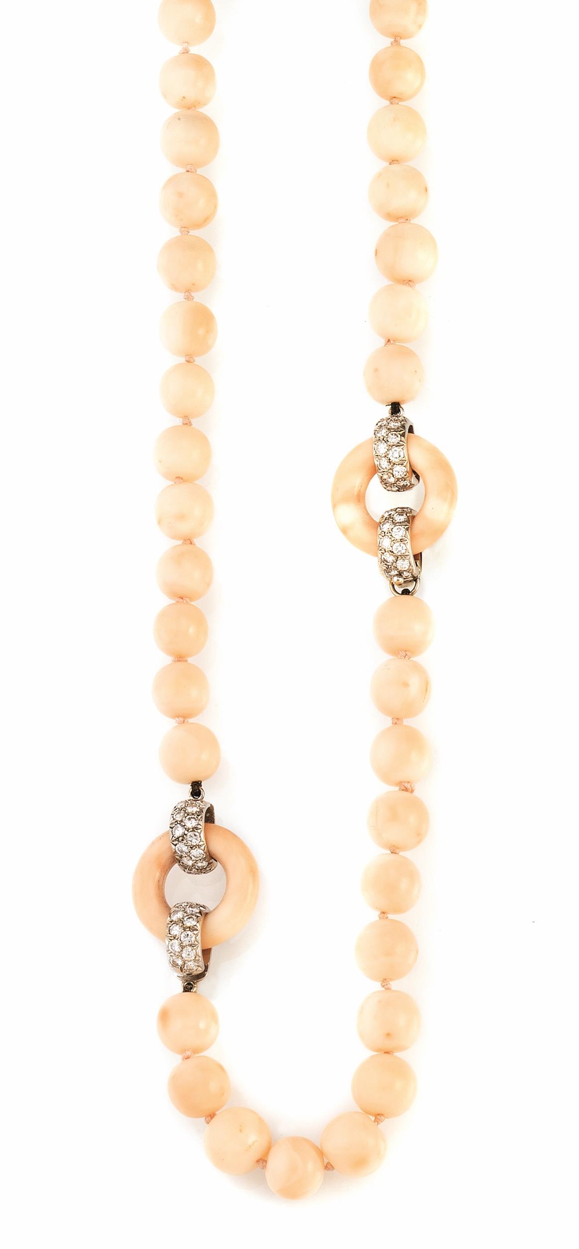 realizzata ad una fila di sfere in corallo rosa di diametro da 9.5 mm a 10.5 mm, intercalate da due anelli in corallo con inserti in oro bianco e brillanti, punzoni Torrini e 750, 78 g