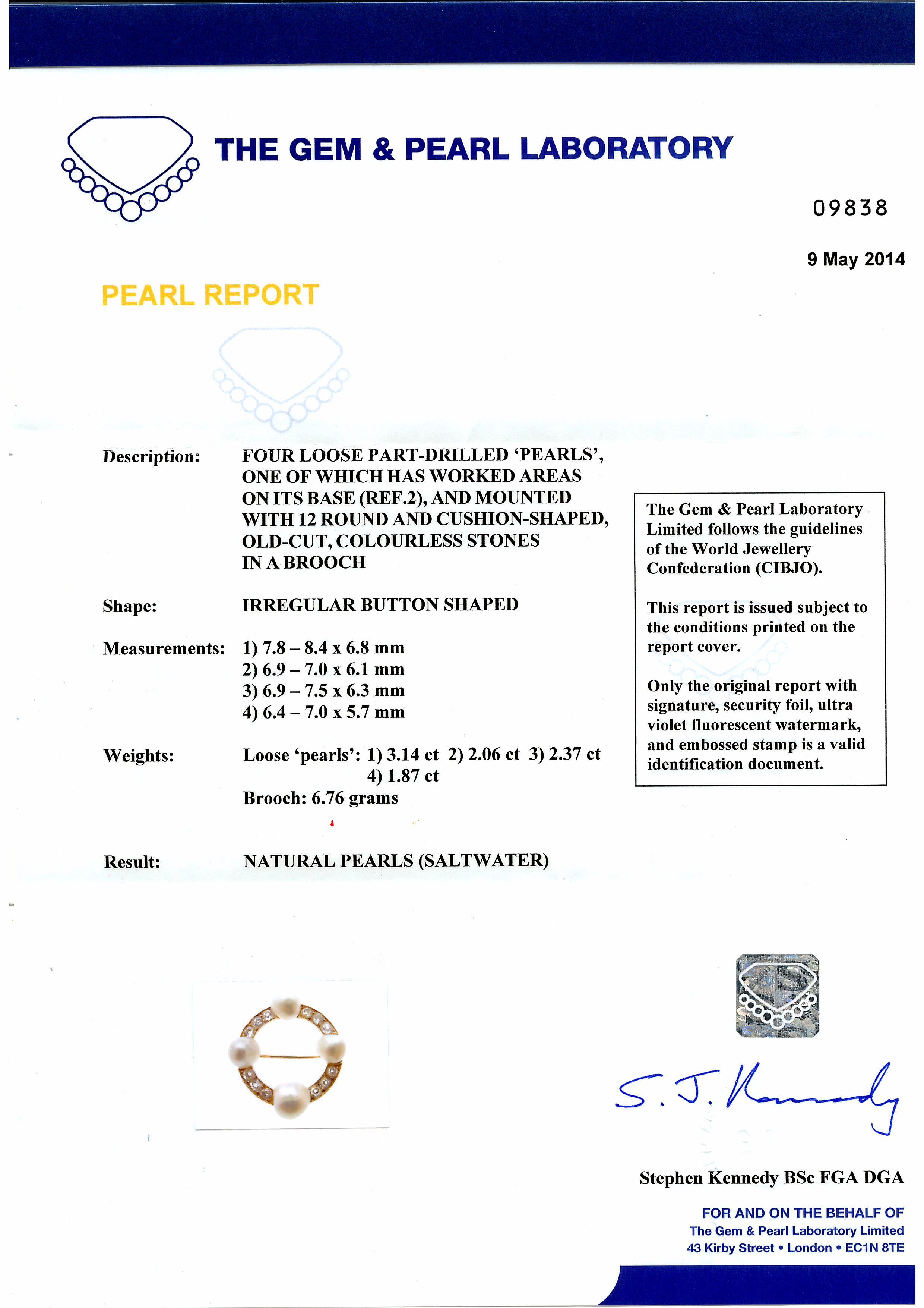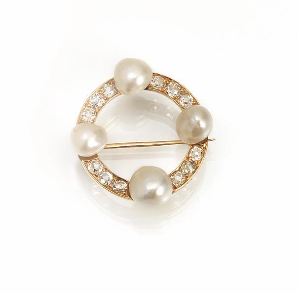 di forma circolare decorata da brillanti taglio vecchio e perle naturali, corredato di certificato The Gem & Pearl Laboratory n. 09838, datato 09/05/2014