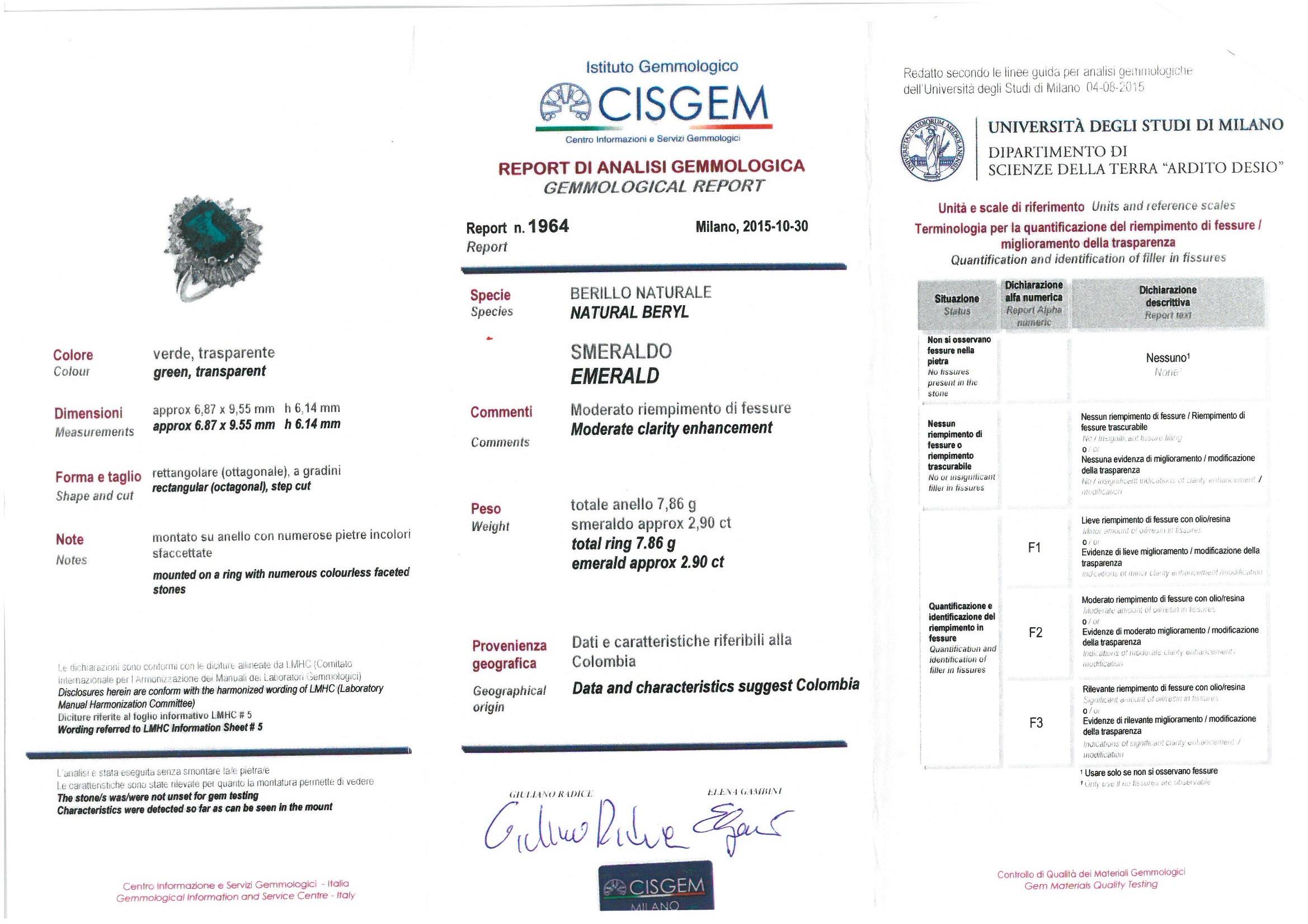 al centro uno smeraldo rettangolare di 2.90 ct entro cornice in diamanti marquise e baguette, corredato di certificato CISGEM n. 1964, datato 30/10/2015