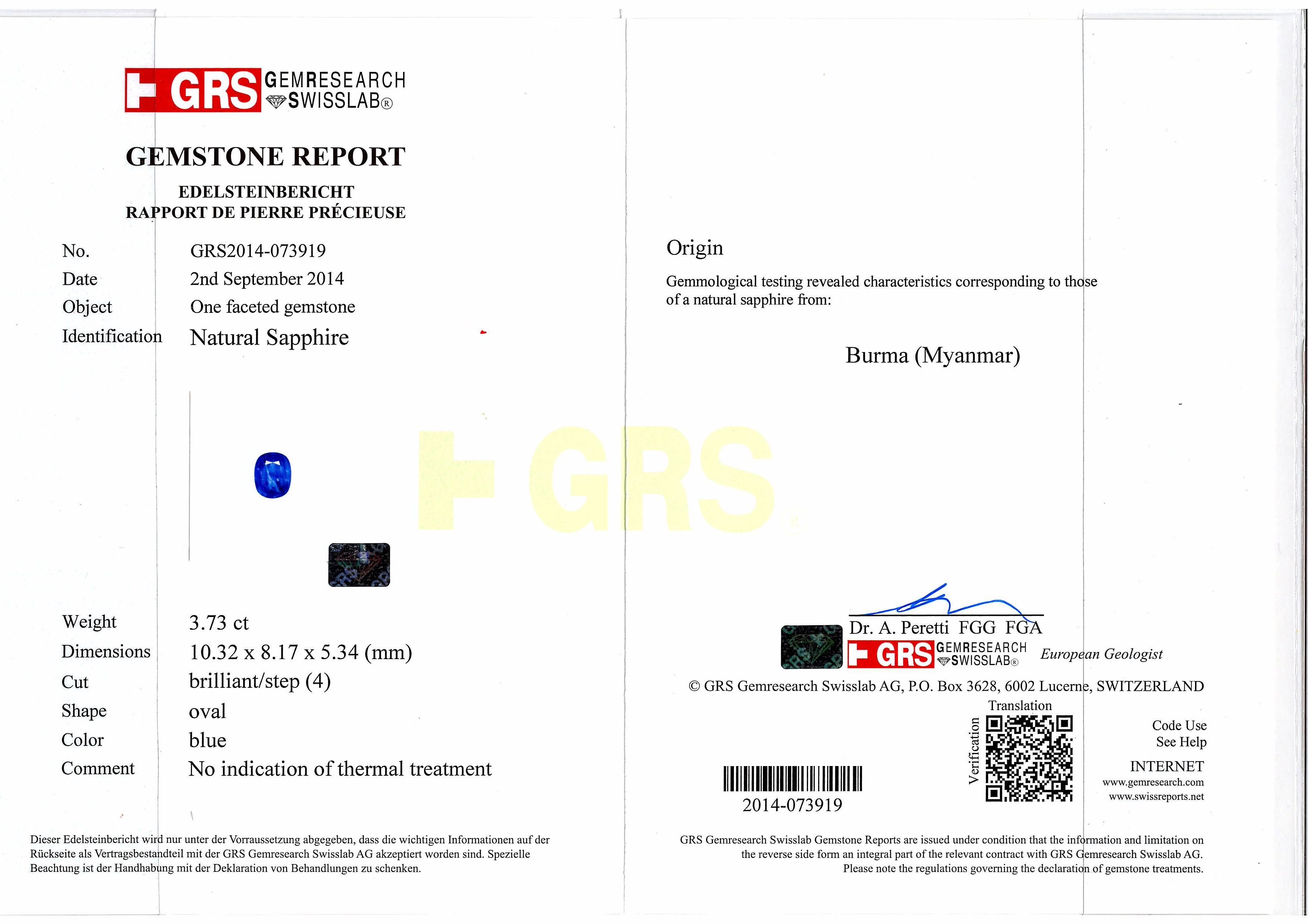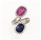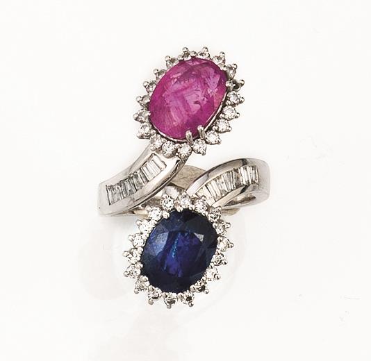 con montatura contrarie decorata in brillanti baguette con finali due zaffiri ovali rosa e blu ciascuno entro cornice in brillanti rotondi, corredato di certificati GRS n. 2014-113346, datato 19/12/2014 e n. 2014-073919, datato 02/09/2014 che indicano origine birmana e nessun trattamento termico