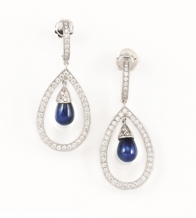 ciascuno realizzato con monachella e goccia in brillanti, al centro uno zaffiro pendente, punzone 750, 9 g