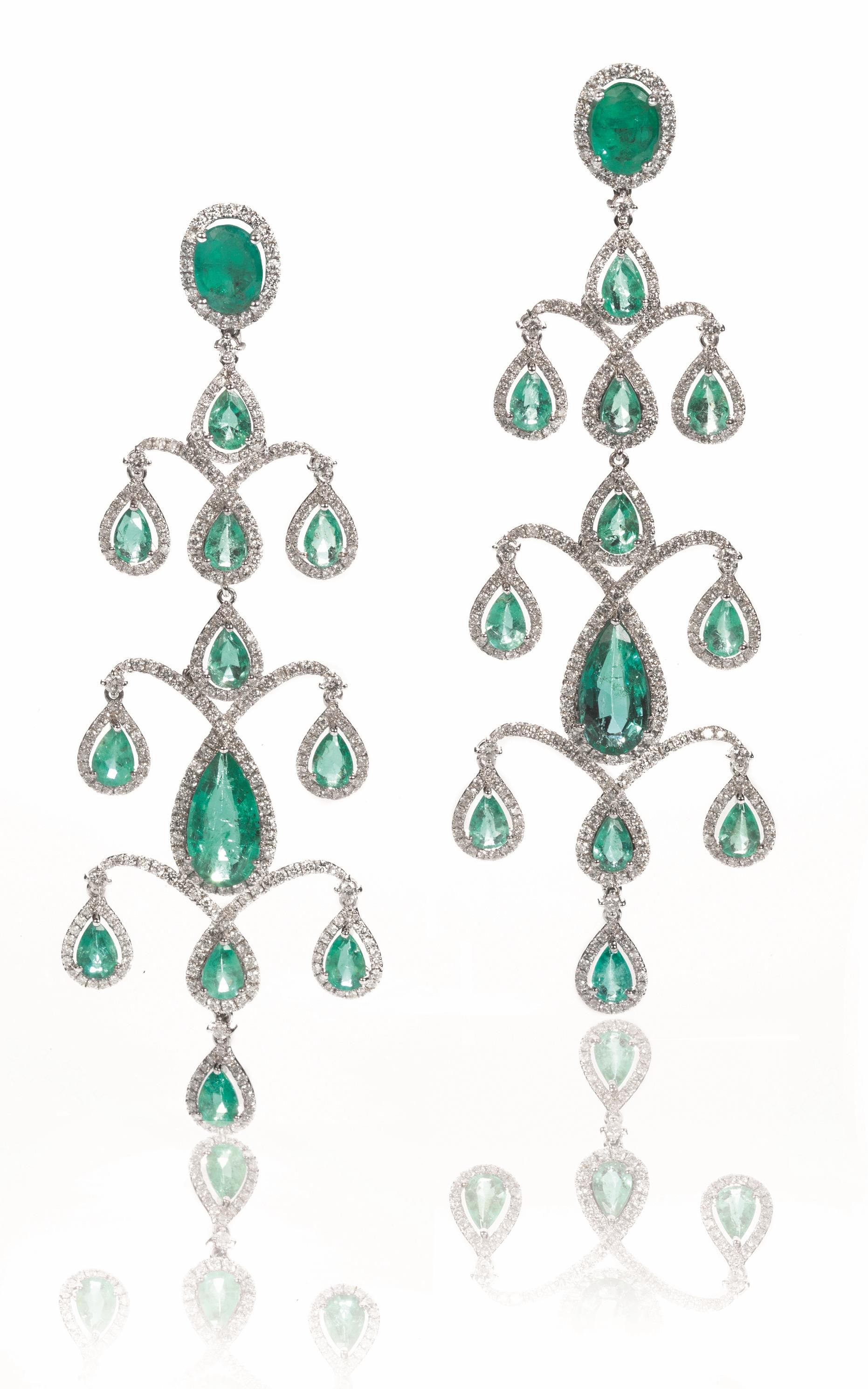 ciascuno disegnato come una tripla girandole con smeraldi a goccia entro cornici in brillanti, punzone 750, 22 g
