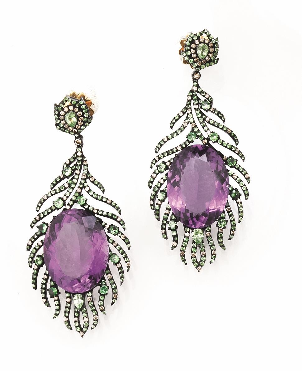 PAIO DI ORECCHINI PENDENTI IN ORO GIALLO, ARGENTO, TSAVORITI, AMETISTA E DIAMANTI